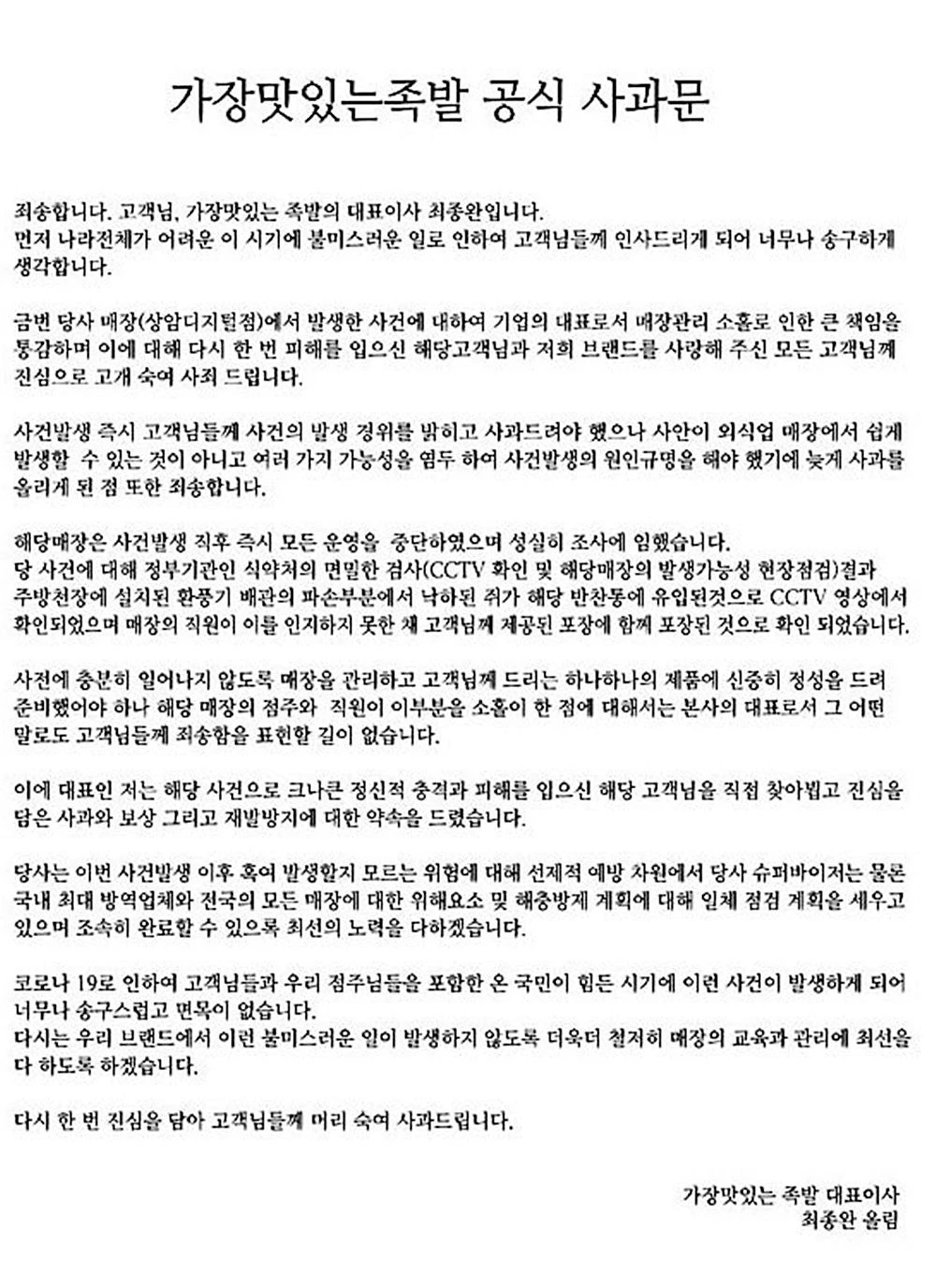 [처음엔 "소비자의 자작극일 수 있다"는 의혹을 제기하기도 했던 프랜차이즈 본사 측은 오늘 책임을 인정하고 공식 사과했습니다. ]