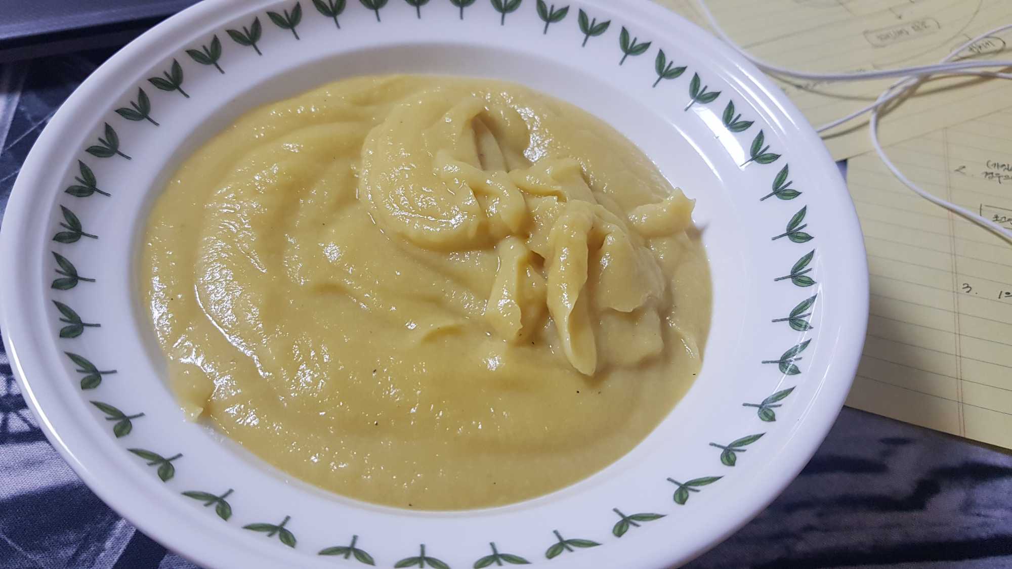 이렇게 만드니 오늘 사용한 스프 그릇에 두 그릇 반에서 세 그릇 정도 양이 나오게 됩니다... 뭐 대충 그렇겠죠?? 고구마 + 우유 400ml + 기타 약간씩의 첨가물 정도이기때문에....
