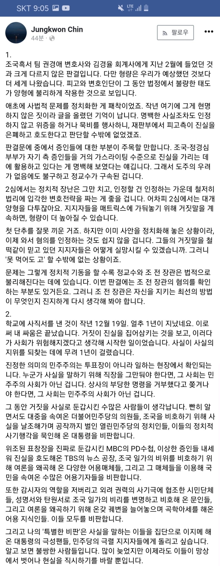 진중권의 오늘 정경심 1심 판결에 대한 소회입니다.