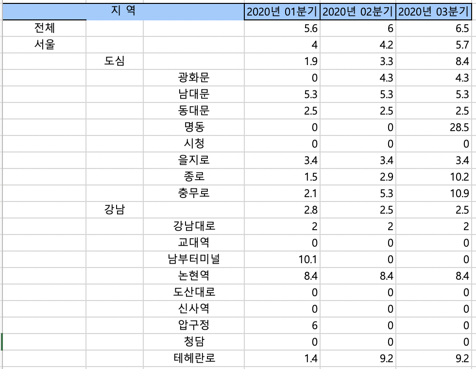https://www.r-one.co.kr/rone/resis/common/sub/sub.do?pageVal=page_4_6 위 출처에서 직접 확인 가능한. 정부에서 만든 통계입니다. 서울에서 소규모 상가 기준 공실률 0%인 곳들이 수두룩하죠?... 현실은 아래 버전입니다. ... 정부 통계에서는, 이 코로나 시국에서도 소규모 상가는 시청, 도산대로, 신사역, 압구정, 청담, 신림역, 망원역, 가락시장, 잠실송파, 숙명여대, 경희대, 건대입구등이 모두 공실률 0%라고 하는데요. 표본 소규모 상가가 '너무 적다보니'.. 해당 상가들만 공실이 아니면 공실률 0%가 나오는 기적의 통계가 완성되고 있습니다.. 압구정 기준으로 '무려 6개 상가'를 표본으로 집계했기 때문에.. 이 6개 상가만 공실이 아니면 0%가 나오는 방식... 이라고 보시면 됩니다 -.-; 모든 통계가 표본조사긴 하지만.. 표본이 저렇게 적은 수인데 이걸로 공실률을 파악한다는건 좀... 이렇게 동떨어진 통계를 정부에서 만들어서, 이걸로 현황을 파악하는건 통계를 안보고 그냥 동네를 걸어다니면서 임대 딱지 붙어있는걸 보느니만 못한거 같은데.. 부동산 통계들 관련해서.. 통계부터 최대한 정상적으로 만들었으면.. 좋겠습니다. 3