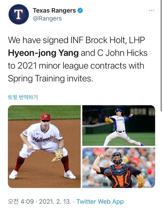 Subject   [MLB] 양현종 텍사스 스프링캠프 초청 마이너 계약