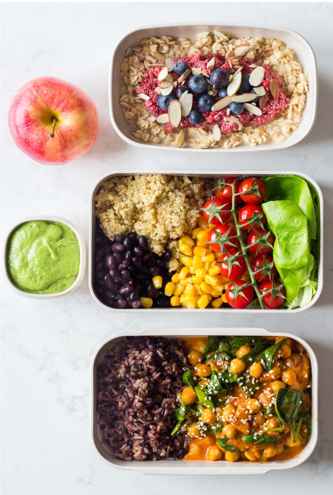 USDA 기준, 하루에 330kcal 분량의 현미밥 세 공기나 동질의 통곡물 대체품(오트밀, 통밀 파스타, 통곡물 빵류 등)을 먹으면 990kcal와 22.8g 내외의 단백질을 획득하며, 시판 두부 한 모(300kcal)와 동질의 대체품(비욘드 미트나 언리미트 등의 콩고기, 버거킹이나 롯데리아의 비건 버거, 다양한 콩 반찬이나 두부 요리나 두유, 진선만두나 대림 선 만두나 혜화당 야채만두, 풀무원 두부너겟이나 푸드머스 장조림 등)을 섭취하면 24g 내외의 단백질을 획득하고, 여기에 타랄리니 같은 비건 스낵이나 동질의 간식을 300kcal 분량만큼 섭취하면 5-6g의 단백질을 획득하여 그날 필요한 탄수화물과 단백질이 섭취되고, 남은 칼로리 예산으로 과채류와 지방류와 설탕 따위를 섭취할 수 있습니다.