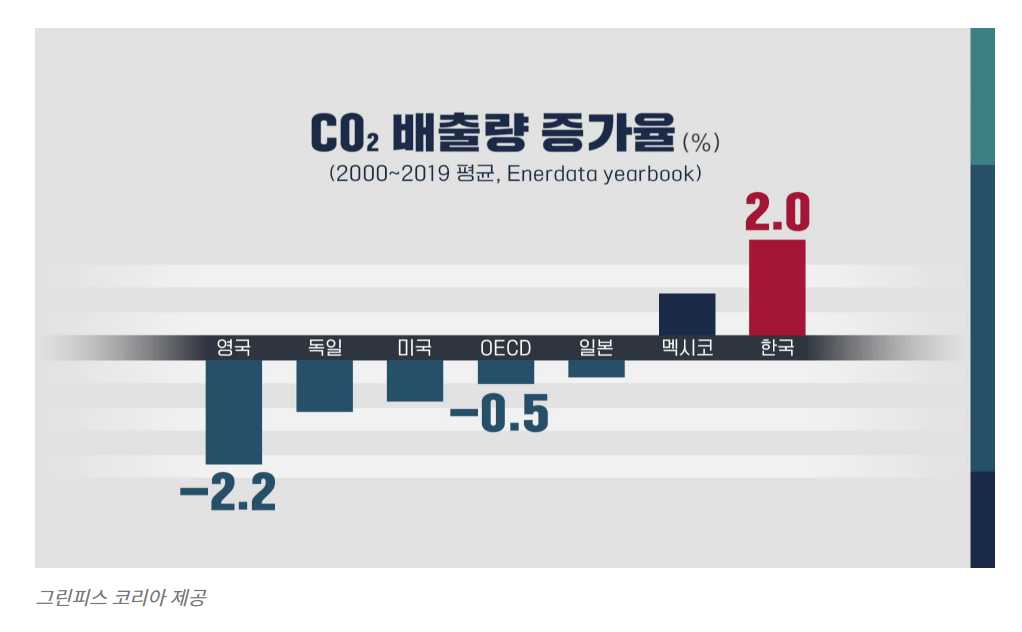 뉴스 게시판에 올라온 조선일보 뉴스(https://redtea.kr/pb/pb.php?id=news&no=24111)를 보고 생각이 많아져서, 기후변화에 대한 기초적인 자료들을 조사해서 글을 써 봅니다. IPCC(Intergovernmental Panel on Climate Change)는 지금과 같은 추세로 지구온난화가 지속된다면 2030년에서 2052년 사이에 1.5℃ 상승에 도달할 가능성이 높다고 보고합니다. 지구온난화가 자연계와 인간계에 미치는 영향은 이미 관측되고 있으며, 육상 및 해양 생태계 대부분과 ‘그들이 제공하는 일부 서비스’들은 지구온난화에 의해 이미 변화되고 있다고 말합니다. 평균온도가 1.5℃ 상승할 경우, 70~90%의 산호가 멸종하게 되고 2℃ 상승의 경우 99%의 산호가 멸종한다는 것이 IPCC의 예측입니다. 육상동물들도 다량이 멸종 위기에 처하고 식물들도 기후변화에 따른 재적응에 실패하여 여러 종들이 멸종위기로 내몰릴 것이라고 IPCC는 예측합니다. 기후변화는 특정 기상현상에 취약한 여러 개발도상국에 더욱 치명적으로 작용해서 빈곤과 대규모 이주를 만들어내고 이미 사회에 존재하는 불안정 요소를 더욱 자극할 것으로 보입니다. 1.5℃ 이하로 기후변화를 통제하기 위해서는 2030년까지 탄소배출량을 45% 이상 감축하고, 2050년까지 순배출량이 제로인 net zero에 도달해야 합니다. IPCC 1.5도 특별보고서에 포함된 이런 내용들은 국제적으로 합의되었고, 한국에서도 채택된 내용입니다. 한국의 탄소배출량에 대해서는 여러가지 기사들이 나와 있어요. 한국의 탄소배출량은 전 세계 1.7%에 불과하지만, 인구대비 배출량으로 계산하면 상황이 달라집니다. KBS의 보도에 따르면 한국인의 1인당 탄소배출량은 세계 6위에 해당합니다. Our World in Data의 자료를 통해 봐도, 소규모 산유국을 제외할 경우, 1인당 탄소배출량 최상위권에 랭크되어 있습니다. 기후변화에 대한 한국인의 책임은 세계 최상위권에 속합니다. 한국인의 GDP 순위나 1인당 국민소득 순위보다 온실가스 배출량 순위가 더 높다는 점도 주목할만 합니다. KBS가 소개한 Enerdata yearbook 자료에 따르면 한국은 20년간 탄소배출량 증가속도가 OECD 국가 가운데 가장 빠릅니다. 2009년 이명박 정부에서 수립되었던 온실가스 총배출량 증감률 하향 목표는 2010년 대비 2017-2019의 총배출량이 오히려 늘어나면서 무산됐습니다. 재생에너지 전환율 역시 2.64%에 불과하고 중국(8.7%), OECD 평균(11.8%)과 비교해도 낮습니다. 독일(29%), 영국(24%)에 비교하기 무색합니다. 매경이 2019년 UNEP 보고서를 소개한 바에 따르면, 한국은 현재 전망치와 2030년 목표치의 차이가 현저합니다. 2010년 대비 20%를 감축해야 하는 목표치에 반해, 전망에 따르면 2010 대비 배출량이 10% 증가할 것으로 보입니다. 물론 20% 감축이라는 것도 국내에서 설정한 자체 목표일 뿐 IPCC가 제시한 목표 감축량에 비할 수 없습니다. 여러 언론이 탈원전 정책의 실패를 한국의 탄소배출량 과다의 주요 원인으로 꼽습니다. 2019년 자유한국당 한 의원이 주장하는 대로라면 원전 발전량은 2016년 대비 17.6%정도 줄었고 화석연료 발전량이 14.1% 늘었습니다. 그런데 2020년에는 2018년 발전량과 비교해 발전량이 20% 증가했고, 원자력 발전비중도 25%에서 29%로 증가했습니다(한겨레 보도). 그러므로 한국의 원전 발전량 변동이 현재의 탄소배출량에 즉각적으로 반영되고 있다고 생각하기는 어렵고, 앞으로의 기후변화 대응 로드맵에 영향을 미치고 있다고 이해해야 할 것 같습니다. UNEP 2019년 보고서에서의 지적 역시 GHG 배출량 로드맵에서 문재인 정부의 원자력 정책에 기인한 전력 부문의 배출 감축량 목표 수정이 있었다는 점을 지적합니다. (64.5MtCO2e per year에서 23.7MtCO2e per year로, 8.8GW 규모의 신규 원전건축 프로젝트 취소에서 기인). 그러나 추가할 수 있는 감축량이 40MtCO2e이든, 그 이상이든, 2030년까지 45%를 감축해야 한다는 IPCC 목표에 비하면, 턱없이 모자랍니다. 2050년 탄소중립 전략에 따르면, 우리나라는 2030년까지 총배출량의 24.4%만을 감축하겠다고 말합니다. 이는 IPCC가 제시하는 2030년 45% 감축목표에 비하면 매우 낮습니다. 한국이 작년 말에 제출한 국가온실가스감축목표(NDC) 보고서에 대해 유엔기후변화협약(UNFCCC)은 목표치를 다시 작성해서 내라고 요구했습니다. UNFCCC는 현재의 여러 국가들의 목표대로라면 2030년 온실가스 배출은 2010년 대비 0.5%밖에 감축되지 않습니다. WHO에 따르면 현재 기후변화로 죽어가는 사람들은 매년 15만명 이상입니다. 기후변화는 인류가 당면한 현재적인 문제입니다. 1.5도씨 이내로 기후변화를 통제하기 위한 예산은 이제 7-8년치밖에 남지 않았는데, 한국 사회에서도 좀 더 본격적인 이야기들을 나눠야 합니다. 한국은 저출산으로 기후변화 대응에 모범적으로 기여하고 있다는 농담이 돌아다니는데, 인구감소에는 시간이 걸리므로 즉각적으로는 별다른 의미가 없습니다. 2030-2050년이라는 기후위기의 중대한 변곡점에 맞춰 배출량을 감축해야 하는데, 저출산이 얼마나 즉각적으로 배출량을 감축할 수 있을지 알 수가 없습니다. 탄소포집기술이나 태양광 반사 에어로솔에 기대하면서 현재의 생활습관을 유지하기에는 기술발전의 개연성이 몹시 불확실합니다. 2030-205