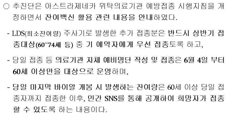 어제 잔여백신 신청 앱으로 일원화 한다고 발표된 내용이 오늘 일부 바뀌었습니다.(지침 명확화?) 예비명단 운영을 6월 4일부터 아예 안 하는 것이 아니고, 60세 이상만 대상으로 예비 명단을 운영하고, 당일 마지막 바이알 개봉 잔여량을 60세 이상까지 접종한 후에, 그래도 남으면 네이버/카카오 통해 공개하고 접수해서 접종하는 것으로 바뀌었습니다.