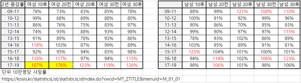 오늘의 핫가이, 준석찡의 당대표 당선과 관련해서 탐라에 젊은 여성 자살율이 폭증한다는 얘기가 있길래 그 뭐랄까, 솔직히 처음엔 그냥 웃어넘겼습니다. 여성보다 남성 자살율이 높은건 수천년째 일상입니다. 이런 현상은 굳이 대한민국 한정이 아닙니다. 사실 어느 나라를 가봐도 마찬가지에요. 하지만 최근 몇년간 젊은 여성들의 자살율이 폭증하는건 뭔가 좀 주시해볼 가치가 있어보이지 않나 싶습니다. 이 분석에서 주의하실점은, 저는 홍성대 저 수학의 정석 이상의 통계는 일절 모른다는 겁니다. 제가 아는건 구글에 키워드를 넣고 대충 검색을 해보면 어디선가 통계결과가 튀어나온다는것 정도입니다. 두번째 표에서 2년 단위로 자살율을 비교한 이유는, 그냥 그렇게 비교해보면 노란색깔로 칠해놓은 부분의 숫자가 더 드라마틱해지길래 2년간격을 골랐읍니다. 2년 증감율이 106% 이상인 곳은 빨갛게 칠했고 2년 증감율을 비교해서 높았던 부분은 빨갛게 그 밑에 깔려 바닥이 되어주었던 부분은 파랗게 칠했읍니다. 106%를 고른 이유는 딱히 없읍니다. 자살율의 단위는 10만명당 고의적자해로인한 사망건수,입니다. 자료의 출처는 https://kosis.kr/statHtml/statHtml.do?orgId=101&tblId=DT_1B34E01&conn_path=I2 입니다. 1 아무리봐도 17-19년의 여성 자살율 증가폭은 드라마틱 합니다. 10대후반부터 30대후반까지의 여성 자살율이 다 증가하고 있어요. 2 10대후반, 20대 전반 여성들의 17-19년 자살율 증가폭은 더 드라마틱 합니다. 2년전에 비해 [180%]씩 늘었읍니다. 이유는 둘중 하나겠죠. 17년이 과하게 즐거운 한해였거나 19년이 지나치게 ㅈ같은 한해였거나. 2.1 같은 기간 남성자살율은 횡보하거나 오히려 소폭 감소하였습니다만 남성 자살율은 증가하는데 여성 자살율은 감소하는 09-11년의 경우도 있는 것을 보면 꼭 남녀 자살율 증감이 같은 추세로 가란 법은 없는것 같습니다. 2.2 17-19년 사이의 여성 자살율 증가가 굉장히 드라마틱했던 것은 사실인것 같으나 엄청 증가해보이는 19년의 여성 자살율도 09년의 여성 자살율과 비교해보면 그때보다는 19년이 낫습니다. 3 18년 19년의 10대후반 여성 자살율은 동나이대 남성 자살율보다도 높습니다. 여간해서는 이런일이 없다는걸 생각해보면 확실히 눈에 띄이는것 같습니다. 4 남녀 할것 없이 2012-2017년 간에는 자살율이 이전/이후 시기에 비해서 뚜렷하게 낮아진 것을 볼수있읍니다. ...여성대통령의 힘이란 이런것인가? 하는 뻘생각이 들었습니다. 사회현상을 분석할줄 모르는 이과생은 이만 도망갑니다. 180%라는 숫자는 아무리 생각해도 기이해서. 지나가는 인문학자분들의 관심을 끌고 싶었을 뿐이에요. 왜 이런겁니까? 인문학도 여러분들의 고견을... 듣고싶습니다 -ㅁ-! 1