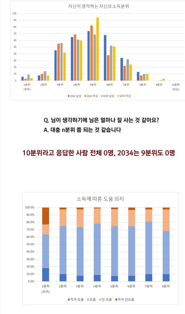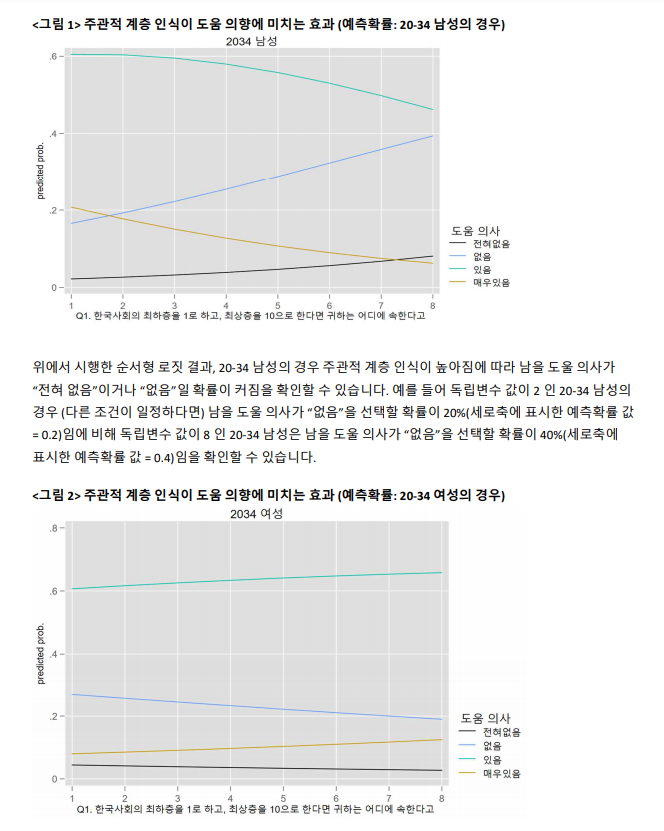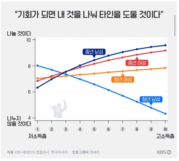 내가 이 프로그램을 처음 접할 때부터 가장 놀랐던 그래프는 <소득 수준과 타인을 도울 의지>에 관한 세대/젠더를 비교하는 그래프였다.