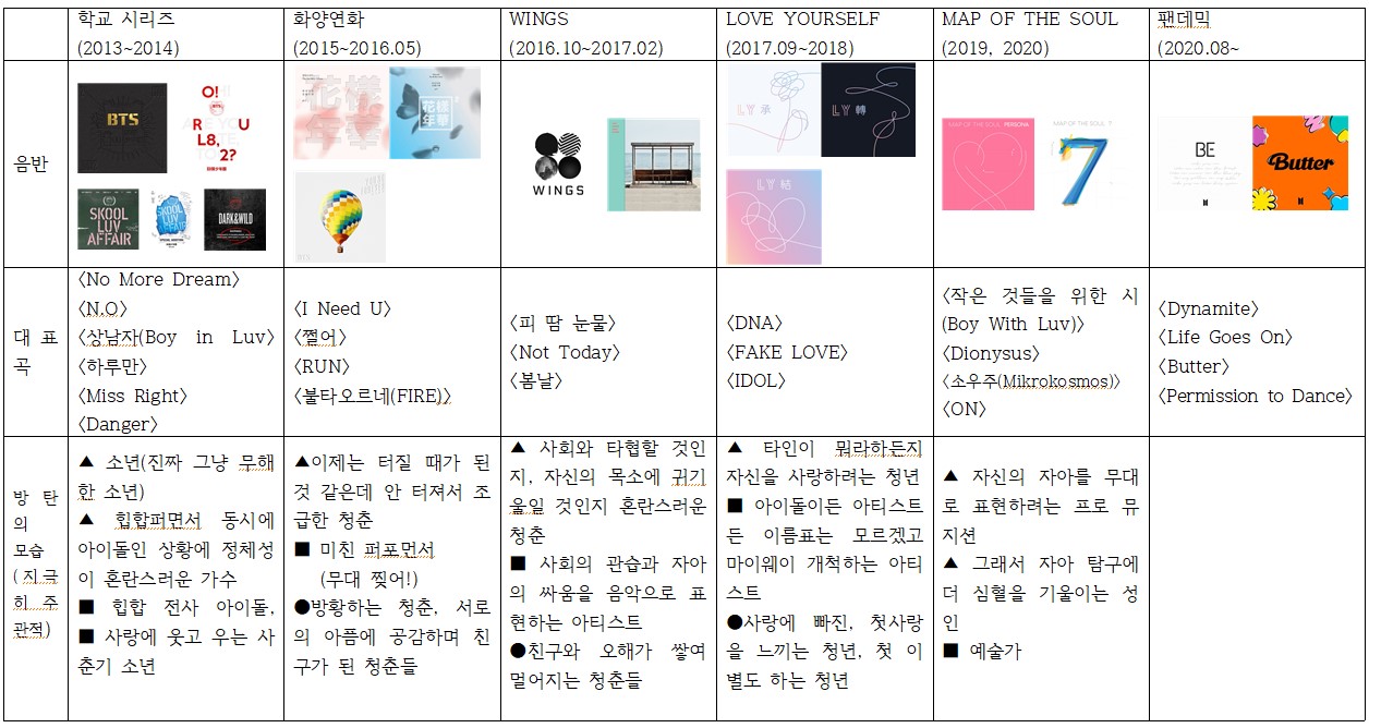 이 글은 아미 분들께 최적화 되어 있고요. 방탄소년단의 “음악”에 관심이 많은 분, 케이 팝 아이돌 콘텐츠에 관심이 많은 분 더불어 방탄소년단 열풍을 사회 현상으로서 유의 깊게 보시는 분들께도 유의미한 글이 되…길 바랍니다. 후…. 우선 아미로서 관등성명먼저 해야겠죠. 일병 순수한글닉, 2020년 3월 부로 아미 입대를 명(?)받았습니다. 네, 저는 2020년 2월 21일에 발매된 『Map of The Soul : 7』 앨범을 듣고 입덕을 했고요. 수많은 입덕 루트 중에 노래를 듣고 입덕한 경우입니다. 그러니까, 멤버들 얼굴도 모르고 인원수도 모르고 입덕해서 차차 공부한 경우라고 할 수 있죠. (기본적으로 저는 외향에 엄청 유혹 당하는 스타일은 아닌 것 같아요.) 그래서 많은 방탄소년단 콘텐츠 중에 음악과 앨범, 무대에 애정이 많이 가고 입덕하고 한 달 안에 모든 앨범, 콘서트 블루레이 DVD(일본 판매분까지)를 다 샀었어요. (계산하니 이것만 150만 원 정도를 썼더라고요.) 보통 입덕해서 아이돌 판다 그러면 연도별로 앨범을 들어보는 것을 생각하실 거예요. 저도 물론 그랬고요. 그런데 하나 듣고 다른 거 듣고 또 듣고 하다가 어? 이거이거 뭔가 있는데? 하면서 잡다하게 알아보고 마구잡이로 정보를 취합하고 정리도 안 되고 혼돈의 초창기 세 달을 보냈었거든요. 물론 이렇게 스스로 알아가는 것에 희열을 느끼신 분들은 제글은 패스하셔도 됩니다. 아 그리고! 음악을 분석하는 게 머리 아파~ 난 그냥 듣고 느낄래~ 하는 분들도 패스하셔도 됩니다. 우선 방탄소년단 활동기는 현재까지 여섯 시기로 말씀드릴 수 있어요. *이건 표로 만든 걸 파일로 첨부할게요. 홍차넷은 그림을 넣을 수가 없군요 ( Ĭ ^ Ĭ )* 저는 이 방대한 방탄의 음악 세계을 세 가지 관점에서 읽었습니다. *위 표의 마지막 행 ‘주관적인 방탄’의 모습은 이 세 가지를 기준으로 제가 느낀 것이에요. -▲자연인 방탄소년단(김남준, 김석진, 민윤기, 정호석, 박지민, 김태형, 전정국)의 이야기 -■음악인 방탄소년단(RM-랩몬스터-, JIN, SUGA, j-hope, 지민, V, 정국)의 이야기 -●BU 세계관의 주인공들 이야기 --------------------------------------------------------------------------------------------------------------------------------------- * 여기서 스피드웨건 ---------------------------------------------------------------------------------------------------------------------------------------- 하나의 곡이어도 어떤 관점에서 읽는가에 따라 의미가 달라져요. 단적인 예로, 『LOVE YOURSELF 承 ‘Her’』 앨범 수록곡인 〈Outro : Her〉에는 “당신이 사랑하는 내가 되기 위해 당신이 사랑하는 걔가 되기 위해서 그 좋아하던 XX도 끊었지.”(SUGA 파트) 라는 가사가 나와요. -▲자연인 민윤기가 연인을 위해 노력하는 모습으로 읽힐 수도 있고, -■아티스트로서 팬에게 최선을 다하는 SUGA의 모습으로 읽을 수도 있는데. -●BU 세계관 뮤직비디오에 SUGA가 맡은 캐릭터가 여친의 권유로 금연하는 장면도 나오거든요. 뒤에 “최고가 되기 위해 노력을 해 이런 모습은 몰랐음 해”라는 가사가 이어지는데 이건 SUGA 군이 실제 인터뷰에서 한 말이기도 해요. 그래서 아티스트로서 말한 걸로 충분히 읽을 수 있죠.뭐 자연인으로서의 모습은 잘 모르겠지만, 연애하고 이별하지 않았겠습니까…. 『LOVE YOURSELF 轉 'Tear'』 앨범 타이틀 곡인 〈FAKE LOVE〉도 세 가지 관점에서 읽을 수 있어요. -▲자연인으로서 연인에게 잘 보이려고 자신을 잃어가는 청년들의 이야기, -■팬들에게 잘 보이기 위해 노력하다 자신을 돌보지 못하는 아티스트의 이야기, -●BU 세계관에서 연인과 헤어지기 전 고뇌하는 캐릭터들의 이야기. 역시나 자연인으로서의 모습은 추측이지만, 적어도 아티스트로 해석할 실마리는 실제 인터뷰나 브이앱라이브에서 확인할 수 있어요. BU 세계관 이야기는 텍스트 콘텐츠로 나와 있고요. 모든 노래가 다 세 가지 관점으로 해석되는 건 아녜요. 또 어떨 때는 자연인의 모습과 아티스트의 모습이 혼용되기도 해요. 한 사람의 여러 모습인데 어떻게 칼로 자르듯 딱 갈라지겠어요. 최근 작품일수록 자연인의 모습과 아티스트의 모습이 쫙 달라붙어 있더라고요. 그래서 더 매력적일지도. 튼, 이렇게 세 가지 관점으로 해석하기 위한 자료는 어떻게 쌓을까요. 저는 아래와 같은 콘텐츠를 보고 나름 구축한 것 같아요. ▲자연인으로서의 모습은 〈달려라 방탄〉, 〈Bon Voyage 시리즈〉, 〈IN THE SOOP,〉 브이앱라이브(특히 투어 중에는 콘서트가 끝나고 저녁/밤에 꼭 브이앱을 켰었어요)에서 많이 봤어요. *스피드웨건: 〈달려라 방탄〉은 방탄 자체 제작 예능, 〈Bon Voyage 시리즈〉는 방탄판 〈꽃보다 할배〉입니다. 그런데 저에겐 이 콘텐츠들은 약간 부가적입니다. 물론 재밌고, 보면 좋고, 돈 주고 산 콘텐츠도 있고 한데(....) 그래도 우선순위를 꼽자면 저는 음악 콘텐츠를 가장 좋아해요. ■아티스트로서 방탄을 읽는 법은 일단 가사를 보는 거죠. 그리고 저에겐 음악 평론가 김영대 님의 책 『BTS : THE REVIEW』가 큰 도움이 됐어요. 의외로(?) 팬심 덜어 내고 전문가의 시선으로 건조하게 음악을 설명하고 있습니다. 어떤 장르의 무슨 노래에 영향을 받은 것인지, 곡 사이사이에 