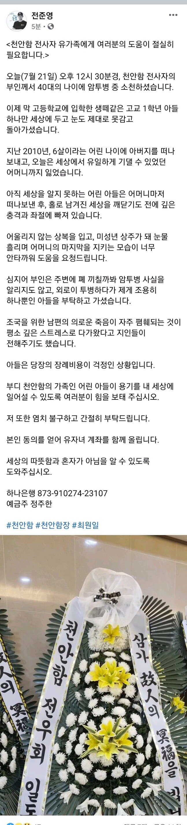 <천안함 전사자 유가족에게 여러분의 도움이 절실히 필요합니다.> 오늘(7월 21일) 오후 12시 30분경, 천안함 전사자의 부인께서 40대의 나이에 암투병 중 소천하셨습니다. 이제 막 고등학교에 입학한 생떼같은 고교 1학년 아들 하나만 세상에 두고 눈도 제대로 못감고 돌아가셨습니다. 지난 2010년, 6살이라는 어린 나이에 아버지를 떠나 보내고, 오늘은 세상에서 유일하게 기댈 수 있었던 어머니까지 잃었습니다. 아직 세상을 알지 못하는 어린 아들은 어머니마저 떠나보낸 후, 홀로 남겨진 세상을 깨닫기도 전에 깊은 충격과 좌절에 빠져 있습니다. 어울리지 않는 상복을 입고, 미성년 상주가 돼 눈물 흘리며 어머니의 마지막을 지키는 모습이 너무 안타까워 도움을 요청드립니다. 심지어 부인은 주변에 폐 끼칠까봐 암투병 사실을 알리지도 않고, 외로이 투병하다가 제게 조용히 하나뿐인 아들을 부탁하고 가셨습니다. 조국을 위한 남편의 의로운 죽음이 자주 폄훼되는 것이 평소 깊은 스트레스로 다가왔다고 지인들이 전해주기도 했습니다. 아들은 당장의 장례비용이 걱정인 상황입니다. 부디 천안함의 가족인 어린 아들이 용기를 내 세상에 일어설 수 있도록 여러분이 힘을 보태 주십시오. 저 또한 염치 불구하고 간절히 부탁드립니다. 본인 동의를 얻어 유자녀 계좌를 함께 올립니다. 세상의 따뜻함과 혼자가 아님을 알 수 있도록 도와주십시오. 하나은행 873-910274-23107 예금주 정주한 #천안함 #천안함장 #최원일 나라를 위해 헌신한 고인의 아드님께 작은 위안이라도 되길 바라면서 소액이나마 송금하였습니다. 인스타나 페북을 따로 하지는 않아서 진실여부를 확인할 순 없지만 커뮤니티들 보다보니 사기는 아닌것 같아서 티타임에도 올려봅니다. 11