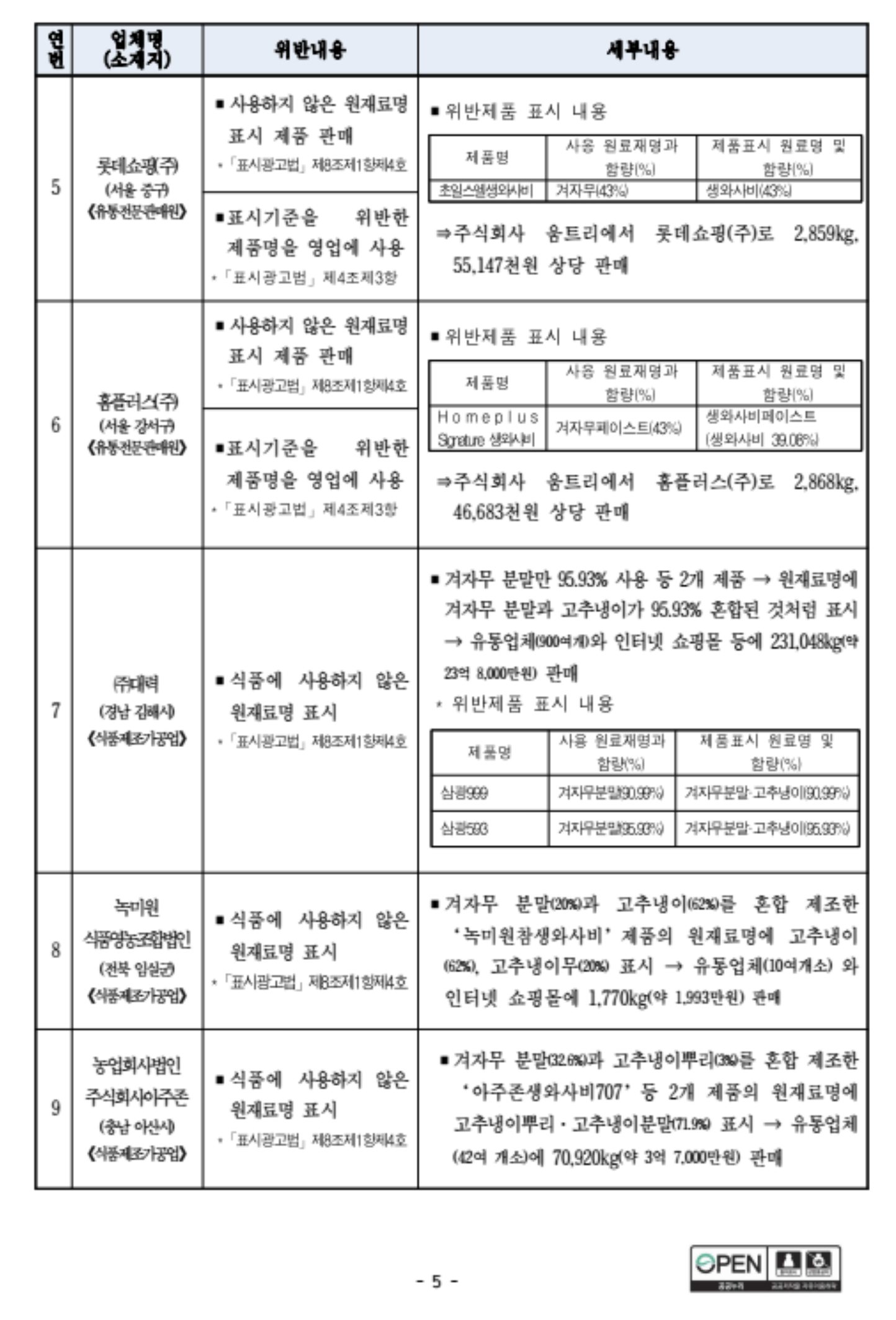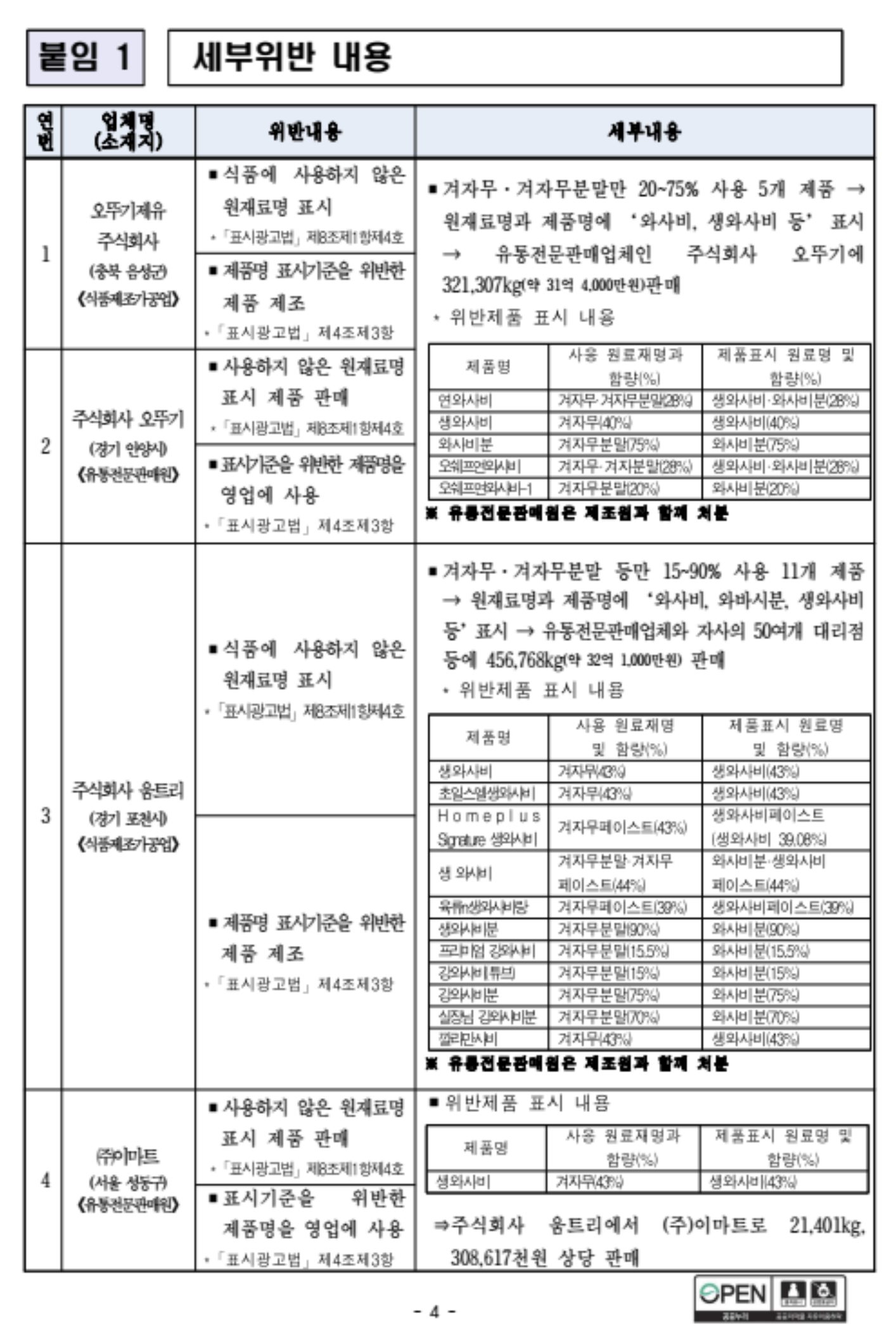 어제 고추냉이 보다 5~10배는 저렴한 겨자무를 고추냉이라고 속여 팔다가 식약처에 적발된 제품들 - 오뚜기 - 연와사비 생와사비 와사비분 오쉐프연와사비 - 움트리 - 생와사비 초일스엘생와사비 Homeplus Signature 생와사비 생 와사비 육류n생와사비랑 생와사비분 프리미엄 강와사비 강와사비(튜브) 강와사비분 실장님 강와사비분 깔라만사비 - 이마트 - 생와사비 - 롯데쇼핑 - 초일스엘생와사비 - 홈플러스 - Homeplus Signature 생와사비 - 대력 - 삼광999 삼광593 - 녹미원 - 녹미원참생와사비 - 아주존 - 아주존생와사비303 아주존생와사비707 1