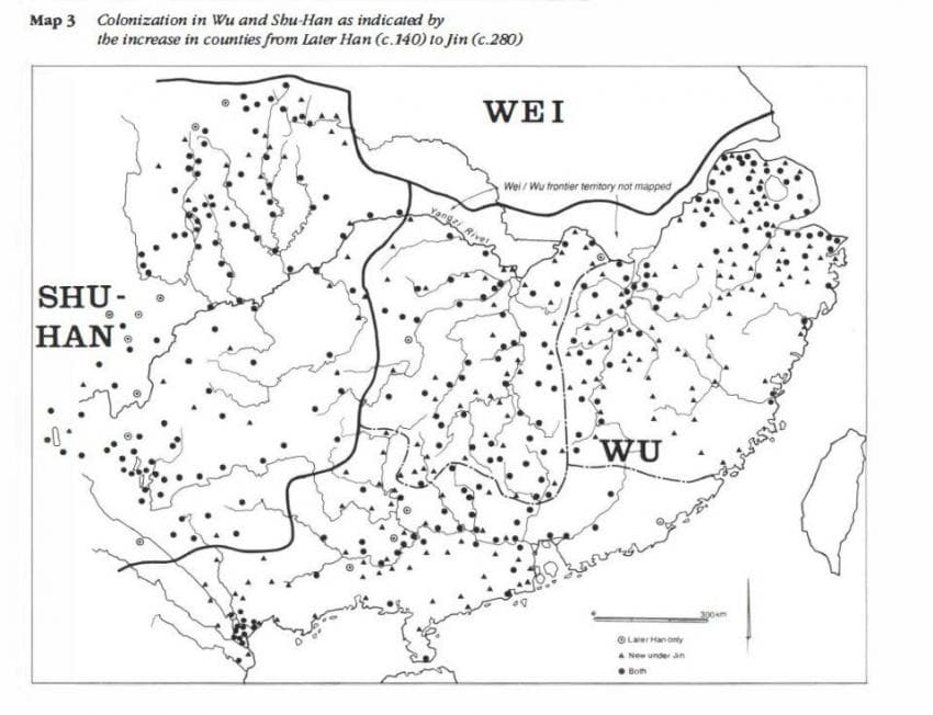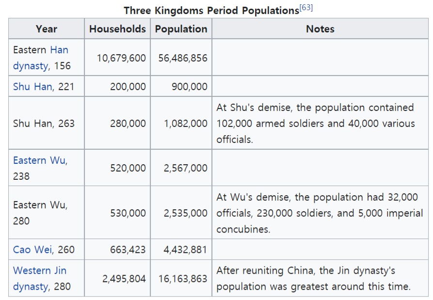 이미지는 ⊙후한대에만 존재하는 현 ▲ 서진 시대 새로 생긴 현(즉 촉,오가 새로 만든 현) ● 후한, 서진 시대 둘다 존재하던 현 이라고 합니다 ---------------------------------------------- 촉한의 항복 당시, 촉한의 인구는 28만 가구, 인구 94만명, 관리 4만, 10만 2천의 군사(under arms)로 이루어진다고 보고 되었습니다.후한 시절 익주의 등록된 인구는 725만명이었고, 성도 근방의 3군만으로도 57만가구, 225만 인구보다 많았았습니다. 20여년 후의 세금 평가 수치를 보존하고 있는 진서 지리지(Treatise of Geography of the jin shu)에서는 지역의 가구를 3백만을 겨우 넘는 것으로 나타내고 있습니다. 이것은 촉한의 기록과도 양립합니다. 이것은 실질적으로 주에 거주하는 사람의 숫자의 감소보다는 세금 쿼터 시스템을 명백하게 암시합니다. 이 시대의 정부는 한나라 때의 지역 행정관이 가졌던 동일한 수준의 수준을 유지할 수 없었습니다. 명목 인구의 감소는 분열된 제국 전체에서 거의 같았습니다. 반면에, 비록 오나라는 한나라의 전통을 반복하려는(might echo the traditions of Han) 정부의 구성을 확립하려는 몇번의 시도를 해왔지만. 촉한은 가장 기본적인 민간 행정 이상은 가지지 못했던 것으로 보인다.(Shu-Han appears to have had no more than the most basic civiladministration.) 제갈량의 죽음으로, 승상부은 사라졌다.(the office of Chancellor came to an end.) 장완은 자신의 선임자(역주:제갈량)의 역할을 대사마직으로 장악했고, 성도 정부의 수반인 비의은 대장군-녹상서사와 익주목이었습니다. 장완의 죽음 후, 비의는 군사 작전본부 한중으로 이동했고, 강유 역시 북쪽의 지휘권과 함께 녹상서사가 되었습니다. 즉 국가의 선임 관리는 군사 직을 확보 있었고 주기적으로 전쟁에서 교전했습니다. 반면 성도의 문관적 문제들(civilian matters)은 유선과 그의 총신들의 손에 있었습니다.(while civilian matters at Chengdu were in the hands of Liu Shan and his favourites.) 이러한 상황에서 촉한의 행정은 군벌 정권의 그것이었습니다(that of a warlord regime), 신병 모집, 군대의 보급에 집중하면서 족장의 개인적 관심 위에 있었습니다.(with emphasis on the recruitment and supply of troops and on the personal interests of the chieftain)물론 일을 돕기위한 사무직 관료도 있었습니다. 그러나 장기적 계획과 발전을 위한 정부는 아니었습니다. 이러한 제한의 결과는 촉한 정부와 남쪽의 땅들(역주: 남만)의 관계에서도 볼 수 있습니다. 유비가 214년 성도의 권력을 장악할 때, 유비의 남쪽 영토를 관리하기 위하여 지역적 관청 내향(庲降)을 설립했습니다. 그리고 220년대 중반 제갈량의 군사원정은 맹획이 이끄는 비중국인 동맹을 파괴했습니다. 아래 단락은 오역 가능성 높음 그러나, 정착지들은 제갈량에게 패배한 부족에게 세금을 부과했음이 관찰됩니다. 제갈량은 다른 권위의 상징과 인장의 파워를 확인하면서, 부족의 원주민 리더들을 계속 콘트롤하기 위해서 사람을 남겼습니다. (It should be observed, however, that the settlement imposed on the defeated tribes by Zhuge liang left the people under the continuing control of their native leaders, confirming that power with seals and other emblems of authority.) 공식적인 측면에서 그들은 촉한의 신하였지만. 기록은 남쪽 군들에서 여러번의 후대 반란을 언급합니다. 비록 큰 어려움없이 지배권에 백성들이 들어왔지만(although the people were brought under control without great difficulty), 그들은 국가의 자원을 현저하게 더하지는 못했습니다.(they did not add notably to the resources of the state.) 이러한 측면에서 우리는 촉한의 정책과 오나라의 정책을 대조할 수 있습니다. 오나라는 최초의 정복에 다음에 확고한 식민지 건설, 지역 control의 새로운 단위의 확립이 뒷따랐습니다. (where initial conquest was followed by firm colonization and the establishment of new units for local control.) 그 결과 150년의 차이가 나는 후한의 인구 센서스와 진나라의 등록치에서 오나라 영토의 카운티(counties 역주: 행정구역?)의 숫자는 2배가 되었습니다.(while the number of counties in the territory of Wu doubled during the century and a half between the census of Later Han and the register of lin) 촉한의 영토에서는 그저 20퍼센트의 순증가가 있었으며 실질적인 발전 프로그램이 없었습니다. (in the territory of Shu-Han there was a net gain of just twenty per cent, and there was no real programme of development) 요컨데, 손권이 양쯔강 중앙에서 자신의 지배력를 확인할 때, 촉한의 유일한 확장 지역은 북방과 남방을 향했습니다. 남방으로 제갈량과 그의 후계자들의 정부는 general authority(일반적 권위?)으로 그들 스스로 만족했다.(the government of Zhuge liang and his successors contented themselves with a general authOrity) 그러나 그들은 그들이 습득한 인적, 물적자원을 발전시키지 않았습니다.(but they did not develop the human and material resources they had acquired.) 대신에 그들은 그들의 노력을 북방에 집중했고, 헛된 공격 속에서 그들의 제한된 힘을 기진맥진하게 만들었습니다. (they concentrated their efforts on the north and exhausted their limited strength in futile aggression.) 촉한은 지방 국가의 군벌적 사업체로 여겨집니다. (ShuHan was founded as a warlord enterprise in a provincial state) 촉한은 그것 이상이