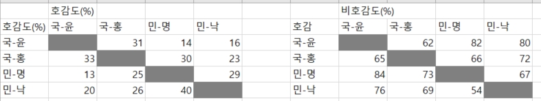 하지만, 상대 후보에게 비호감을 느끼는 지지자가 많은 명-윤이 되면 최대한 자기 진영을 집결 시킬수도 있겠다 싶습니다.