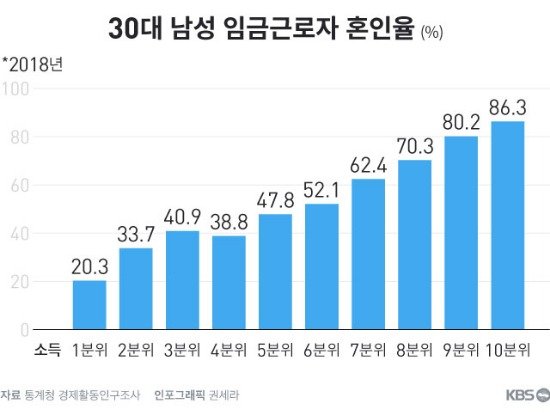 ![]() - 통계청 자료 기준으로 30대 남자의 경우 소득과 기혼율은 완벽하게 일치합니다. 단지 10년전에는 소득이 낮았어도 결혼을 절반은 했다면 이젠 소득이 낮으면 결혼을 사실상 못한다는게 크게 변한점이긴 한데.. 출산율을 높이기 위해서는 한국은.. 미혼 출산은 거의 없는 나라기 때문에 일단 결혼을 많이 해야 되는 상태고 결혼을 하기 위해서는 결국 남자의 경제력이 필요하다. 는게 현실인데요. 특히 하위 소득의 기혼율이 내려가는 이유중 하나는.. 하위 소득이 버는 돈이 물가상승률 생각하면.. '10년전보다 더 못버는 상태' 가 되었기 때문에.. 도 시너지를 만들고 있다고 보시면 될거 같습니다. 자료 자체는 코로나 이전이라. 코로나 시대가 반영이 안되긴 했는데. 사실 통계라는게 '수집하고 정리하고 나오고 하는 시간상' 2~3년 전 자료가 최신 자료인게 현실인지라.. 과거에는 1분위도 57%가 결혼을 했다면 지금은 6분위도 52%가 결혼할 정도로.. 중하위에서 엄청나게 감소했고. 상위는 과거와 비슷하게 많이 하는 상태. 라서 확 감소해버린.. 2