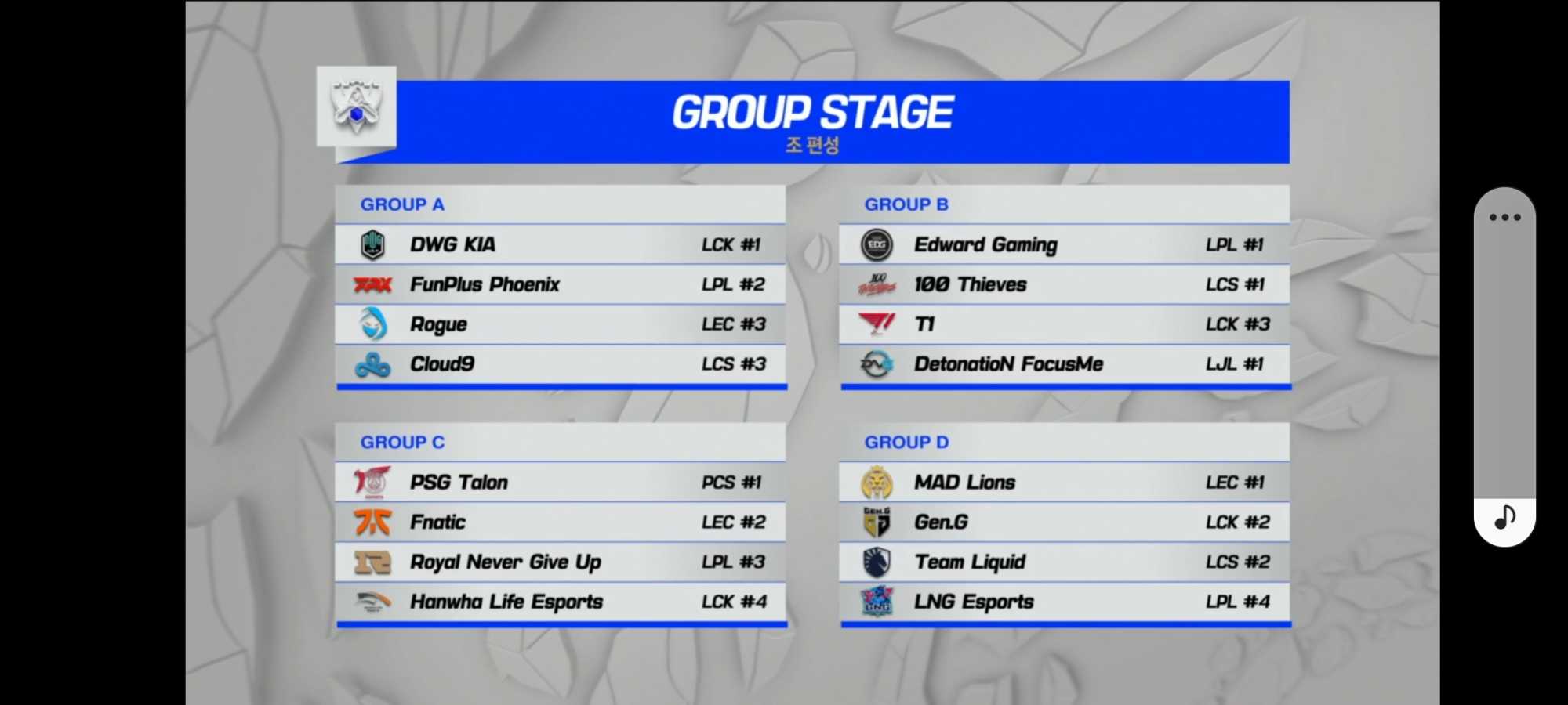2021 월드 챔피언십 그룹 스테이지 1라운드 3일차 아이슬란드 레이캬비크 뢰이가르달스회들 실내 스포츠 경기장 (단판 더블 라운드 로빈,11.19버전) (밤) 20 : 00 Royal Never Give Up vs Hanwha Life Esports 21 : 00 MAD Lions vs LNG Esports 22 : 00 FunPlus Phoenix vs Rogue 23 : 00 PSG Talon vs Fnatic (오전) 24 : 00 Gen.G vs Team Liquid 01 : 00 DWG KIA vs Cloud9 02 : 00 Edward Gaming vs DetonatioN FocusMe 03 : 00 100 Thieves vs T1 금목서 속 은목서 : 오늘이 고문당하는 날인가 봅니다( -_-) 14일 경기 없읍니다 1
