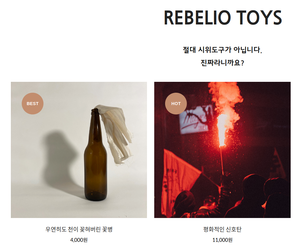 https://rebelio.co.kr 홈페이지에 들어가면 제일 먼저 눈에 들어오는 멘트부터 강렬한데요 "당신의 반란, 레벨리오" 사회민주주의 무정부주의 자유지상주의 보수주의 국수주의 등등 다양한 정치 관련 물품을 팝니다 "우연히도 천이 꽂혀버린 꽃병" 이라는 정신나간 물품도 파는데요 컨셉이 신선해서 소개해봅니다. 3