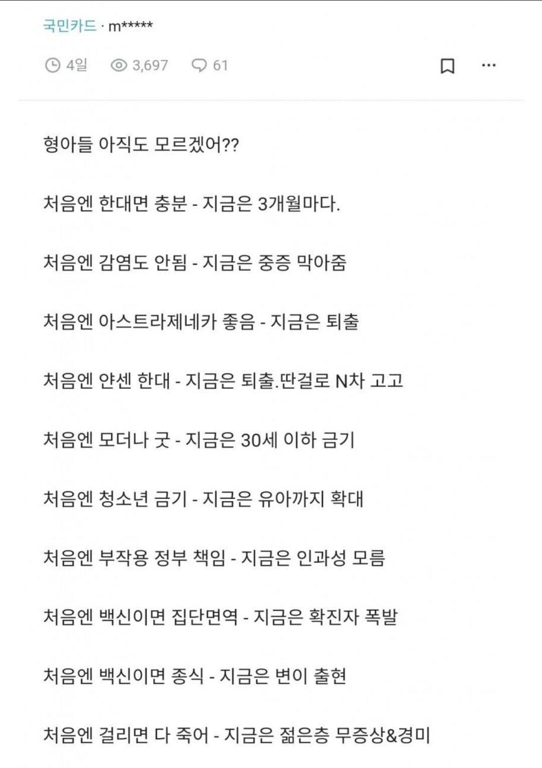 현 정부는 코로나 정국에 접어든 이후 지속적으로 리스크를 국민들에게 전가하고 'K-방역'은 홍보하는 방식을 취해왔습니다. 당장 올해 들어 정부가 코로나 관련해서 잘 결정한 일이 무엇이 있는지 기억이 안납니다. 공보의들을 비롯한 의료진의 묵묵한 희생이 없었다면 현 정권의 의료 시스템은 진즉에 붕괴했을겁니다.** 코로나 관련 지표는 당연히 우리나라가 우수합니다. 그런데 그것은 절대로 현 정권의 성과가 아닙니다. 대의적 차원의 통제를 잘 따르고, 각자도생에 익숙한 국민성 때문입니다. 박정희와 전두환 시기를 거치며 국가가 엄청나게 성장했음에도 불구하고 그들을 인정하지 않는 사람들이 많은 것은 그 이유 때문입니다.
