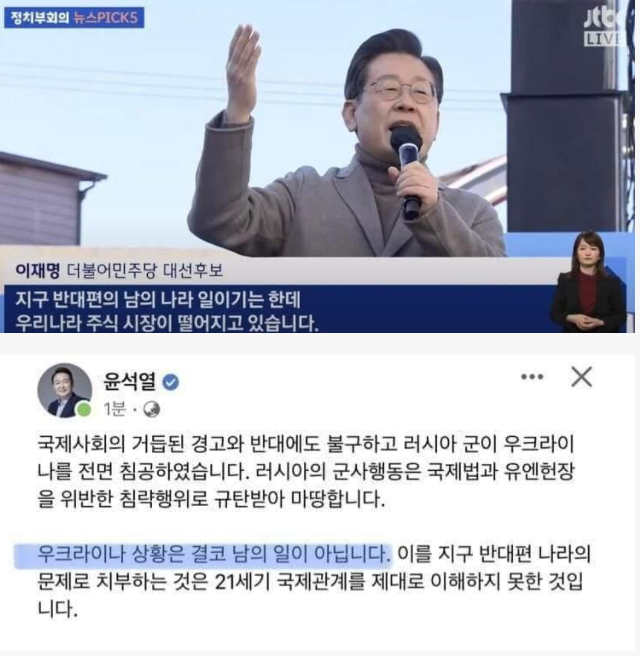 선생님 말씀에 동의하는 부분이 하나 있는데, 바로 애초에 윤석열 후보가 토론회에서 우크라이나에 대해 했던 이야기도 똑같이 헛소리라는 점입니다. 바꿔 생각하면 이재명이 같이 똥볼만 안 찼어도 지금 우크라이나 관련 발언으로 욕 먹는건 윤석열 후보였겠죠.