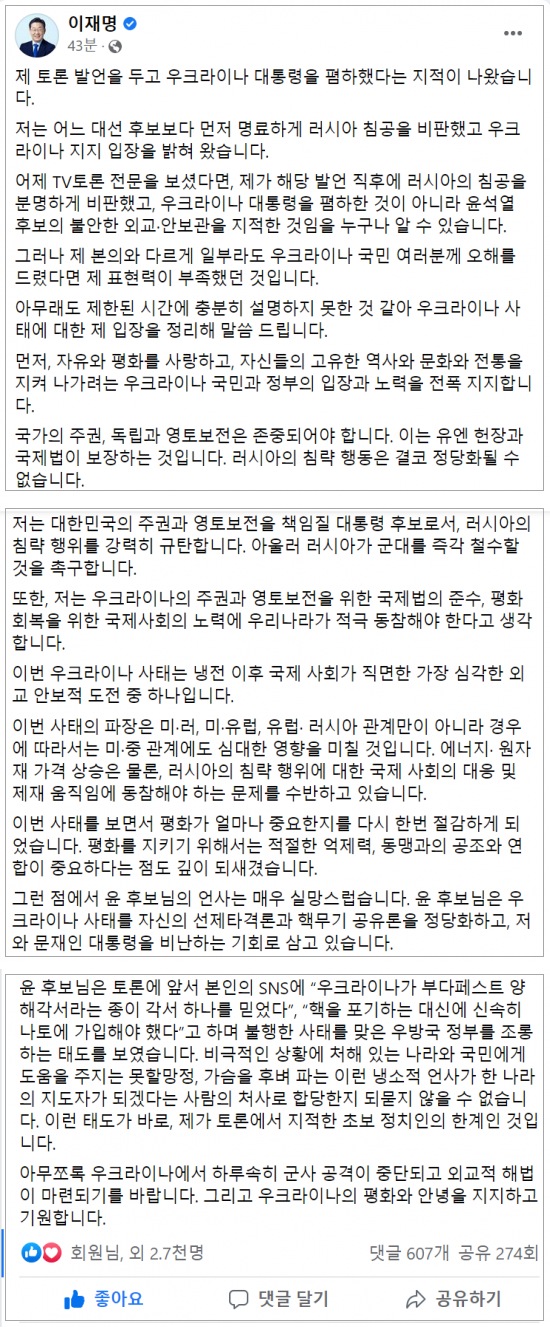 "러시아 우크라이나 전면전이 나기 전"에는 이재명 같은 시각이 옳지않았을까 하는 생각이에요.