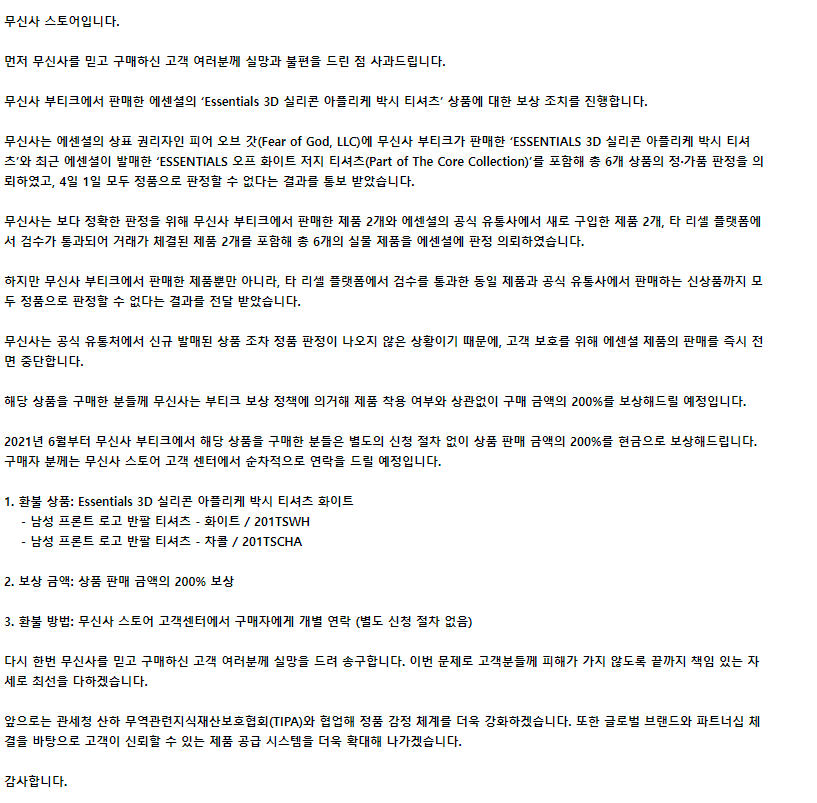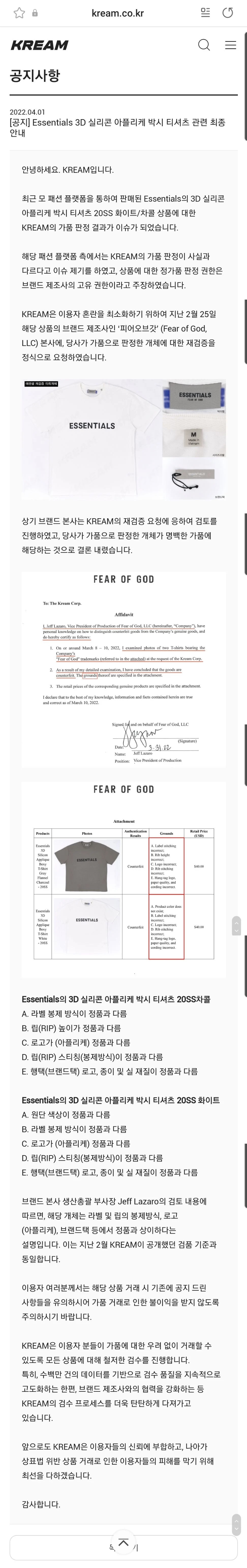 https://kream.co.kr/notice/297 https://store.musinsa.com/app/cs/notice_view/6909?page=1 간단하게 요약하면 무신사에서 위 옷을 산 사람이, 크림에 리셀을 할려고 올림 -> 크림에서 짝퉁이라고 판정을 내림 무신사는 진짜라고 했으나, 크림은 짝퉁이라고 했고 몇달간의 상호 공방과 소송전이 진행되고 있던 중에.. 오늘 크림이 '만든 사람이 직접 짝퉁이라고 했다!!' 라는 완벽한 인증서를 공개해버렸고. 무신사에서 몇시간 뒤 공식적으로 해당 제품 구매자에게 일괄 200% 보상 지급. 공지를 올렸습니다. 3개월간의 대결의 끝이 크림의 완승으로 끝나면서. 무신사와 솔드아웃은 큰 타격을 입을거 같네요. 2