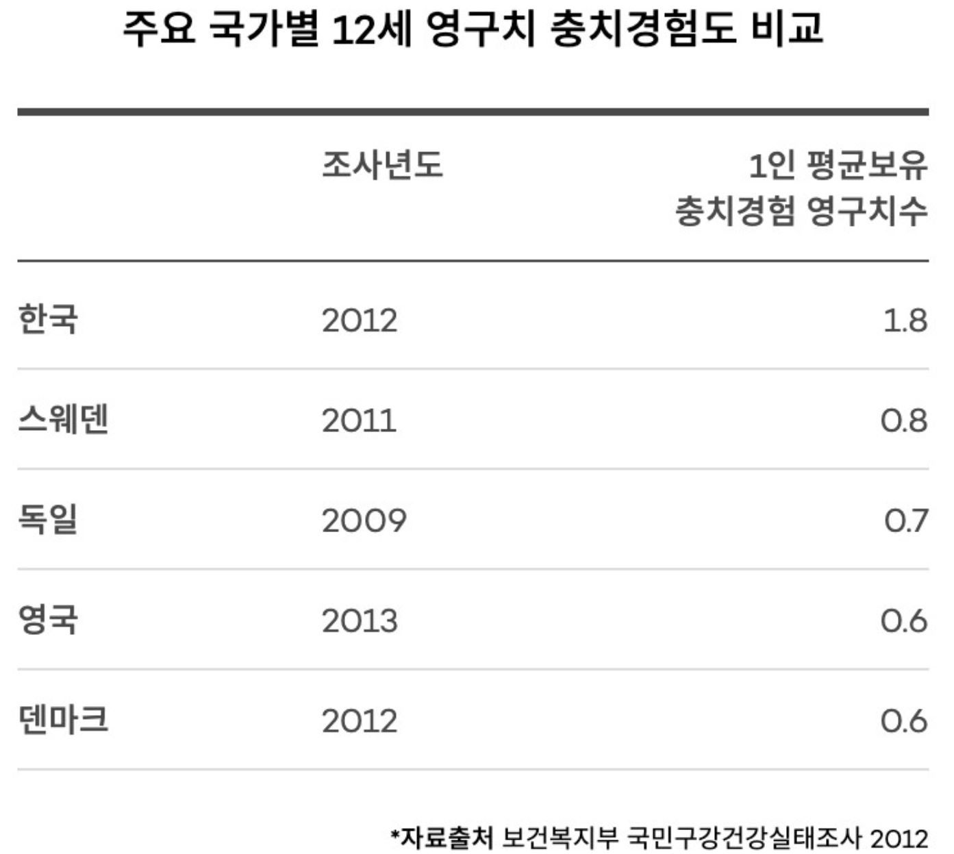 제가 찾아본 바에 의하면 불소 1000 ppm미만의 치약은 충치 예방 효과가 별로 없다고 하는데, 한국 치약은 다수가 1000ppm 미만입니다.  아이 치약은 말할 것도 없고요.  (직접 확인하지 않았으나 듣기로는) 외국의 경우 수돗물에 불소 넣은 경우도 많은데, 우리나라는 예전에 인천에서 수돗물 불소 논쟁이 있었으나 결국 사용하지 않는 것으로 결정하였습니다.  저도 의료계 종사하고 있는데 외국에 비해서 한국에서는 공장에서 만든 것이나 약, 수술 같은 것에 대한 거부감이 강한 편임을 종종 느끼곤 합니다.  그런데 문화적인 거부감으로 합리적인 판단이 되지 않아 충치가 많은것 같아서 안타깝습니다.  이미 학계에서는 결론이 난 이야기인데도 우리나라는 제대로 된 치약을 쓰지 않는 경우가 많았다는게 놀랍네요.