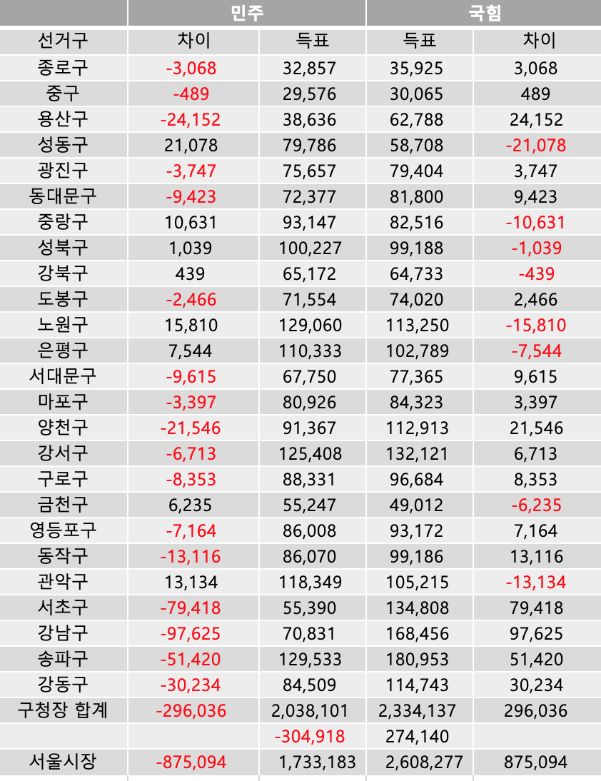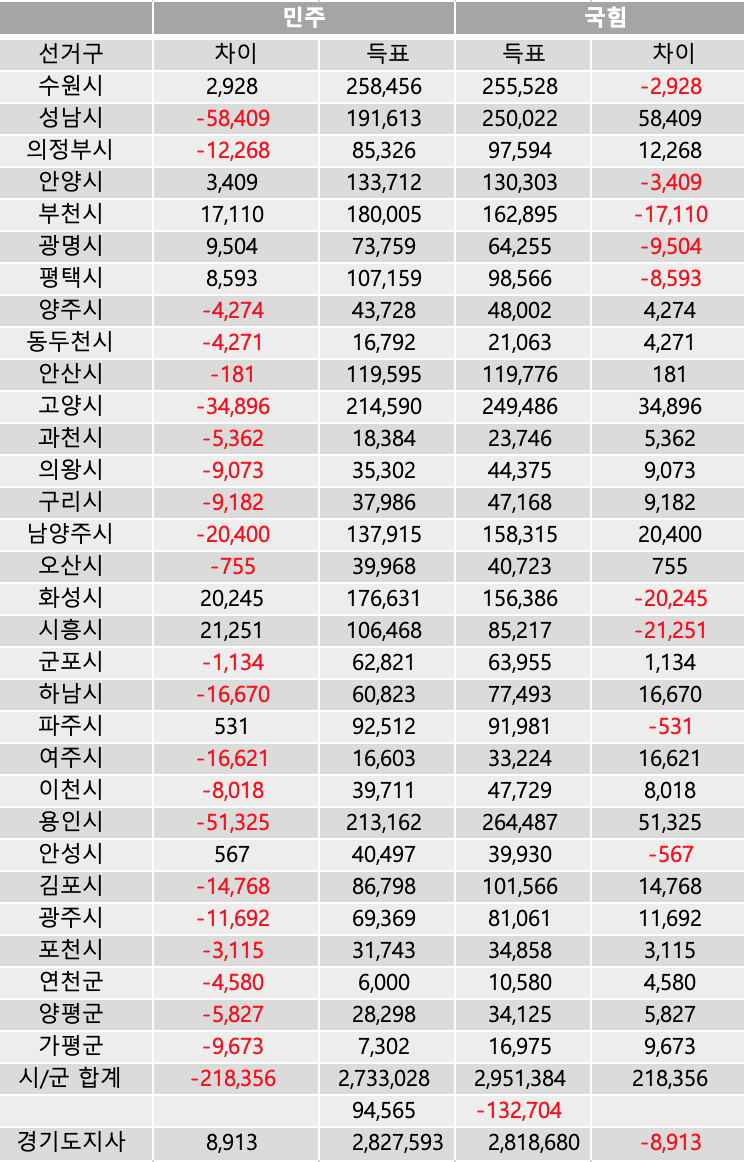 -> 서울 구청장 합계로는 국힘이 +29만표를 더 먹었으나 서울시장은 국힘이 +87만표를 더 획득.. 즉 오세훈과 송영길의 인물 차이로 인해 압도적인 차이가 났다 or 원래 이정도 차이 날거였는데. 민주당의 구청장 후보들이 괜찮아서. 구청장에서는 차이가 줄었다. 어느쪽 해석이던. 결국 인물 버프가 있었습니다. ![]() -> 경기도의 시장과 군수의 합계는 국힘이 +21만표를 더 먹었으나 경기도지사는 민주당이 +8천표를 더 먹어서 막판 승리. 즉 김동연과 김은혜의 인물 차이로 인해, 불리한 판이 뒤집혔다.. 가 중론인 해석이 나오긴 하는데. 생각해보면 '송영길이 서울시장 나가서 생긴 보궐자리에 이재명이 당선' '김은혜가 경기도지사 나가서 생긴 보궐자리에 안철수가 당선' 인 판에서는 사실 이런 결과가 나오는게 맞는거 같기도.. 0