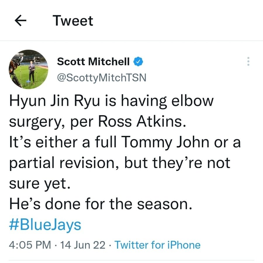 It is possible that Ryu needs a full Tommy John surgery, with the second option being a partial, more minor repair to the UCL. This will be determined during the procedure, which will be performed by Dr. Neal ElAttrache. 안녕하세요 김치찌개입니다! 류현진선수가 팔꿈치 수술로 시즌 아웃이라고 합니다 토미존이나 부분 수술을 받을 계획이라는데요 인터뷰에서 아프다고 말한 경우는 거의 처음이라 느낌이 싸했는데 안타깝습니다ㅠ 수술 잘 받기를.. 0