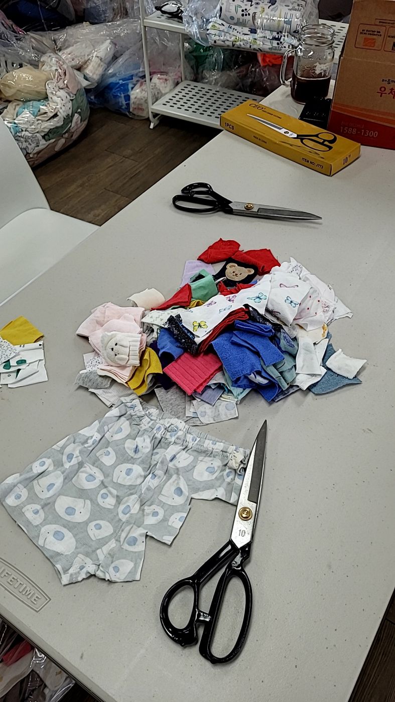 작업복 챙겨가길 다행이다 싶었던, 정말 엄청난 업무를 처리한 1차에 비해 2차는 사실 한 게 별로 없습니다. 비 오는 날 구호품을 담아 정리할 플라스틱 상자를 하차한 일이랑 두 번째 사진에서 보듯 발달장애인의 미술 교육을 위해 탈에 붙일 각종 색감과 재질의 옷을 오리는 일 두 가지를 처리했습니다. 이 옷들은 기증받은 헌옷 중 오염이 심해 쓸 수 없는 것의 일부를 잘라 재활용하는 용도입니다. 이런 섬세한 구분도 마음에 들더라구요.