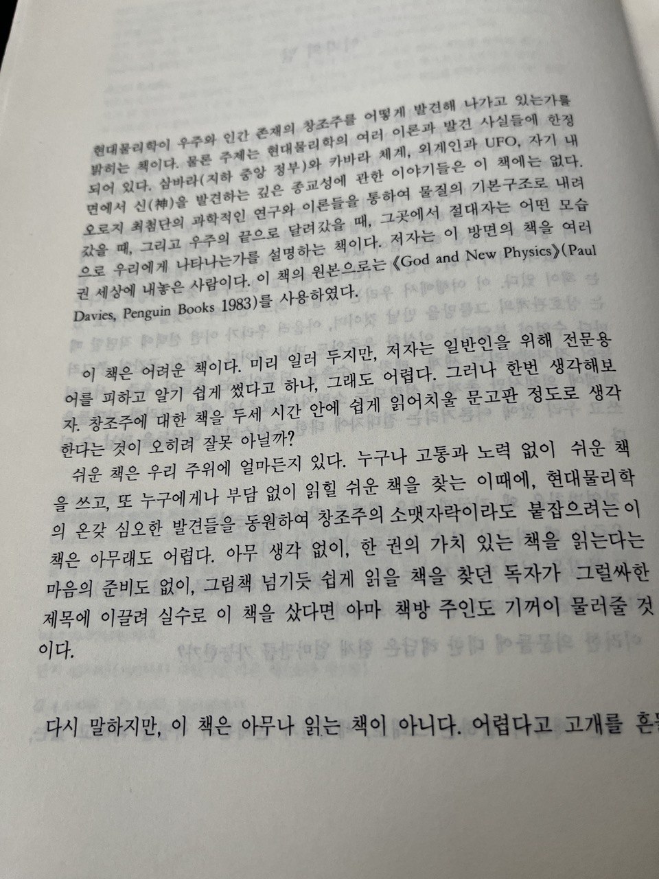 고등학교 2학년 때였던거 같네요. 옆에 앉아있던 친구놈이 마이마이를 귀에 꽂고 뭔가를 열심히 보고 있었습니다. 제목은 "현대물리학이 발견한 창조주"?? 저는 문과계열이라서 제목부터 맘에 들지 않았지만, 너무 열심히 보고 있길래 흘깃거리며 저도 같이 읽어보았네요. 몇페이지를 읽었는지는 모르겠습니다. 친구가 책을 놓자마자 " 나 이거 잠깐만 빌려볼께" 하며 냉큼 가져왔습니다. 며칠뒤 다시 돌려주고 싶지 않았어요. 그래서 친구한테 물어봤습니다. "지난번 그책 나 가져도 됑?" 친구는 흔쾌히 말했습니다. "응" 대신 딴거로 쏘라고..ㅎㅎ 정말로 10번이상 읽은것 같습니다. 결혼하고 이사다니다 보니 어느날 문득 책장이 허전하더군요. "아.. 잃어버렸구나" 다시 구매했습니다.. 1988년 4월 5일 초판... 2016년 11월 18일 27쇄... 역시 이책은 나를 실망시키지 않고, 열심히 커 왔네요. 특히 서문에 써있는 "이책은 어려우니까 대충 보려면 놓고 가세요"라는 멘트에 나도 모르게 도발해버린 기억이 ㅋㅋ 나의 손때묻은 기억과 책장이 더 이상 남아있지 않지만.. 그 추억만으로도 너무나 행복합니다. 이책을 보다가 중간중간 프랙탈?관련 서적도 사고, 종교에 대한 근원적 의문에 대해 고민도 해보고 ㅋㅋㅋㅋㅋ 또 다시 읽어보려구요. 폴데이비스, 류시화... 사랑합니다~~; 1