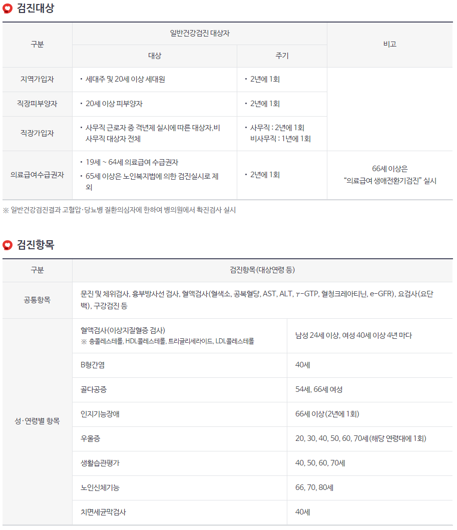 1. 들어가며 다들 성인이 되면 건강검진을 많이 하실 겁니다. 국가검진, 직장인 검진, 종합검진, 특수건강진단 등 다양한 건강검진이 있는데요. 이중 국민건강보험법에 의거하여 시행되는 국민건강보험공단의 일반건강검진에 대해 다루어 보고자 합니다. 암검진은 한 번에 다 쓰기엔 내용이 많아 따로 쓸 예정이며, 구강검진이나 영유아건강검진은 제가 아는 바가 없어 다루지 않겠읍니다. 2. 검진대상자 보통 직장인 검진이나 국가검진이라고들 많이 부르는데 사실상 둘은 같은 것이라고 봐야 합니다. 왜냐하면 원래 직장인을 대상으로 하는 것은 산업안전보건법에 의거한 근로자 건강진단인데, 현재 이 건강진단을 그대로 하는 곳은 없읍니다. 검사항목이 국민건강보험공단의 건강검진에 비해서 적고, 갈음이 가능하기 때문입니다. 따라서 국민건강보험에 가입된 만 20세 이상의 사람이라면 모두 국민건강보험공단 일반건강검진의 대상자라고 볼 수 있겠읍니다. 출생년도를 기준으로 삼아 2년에 1회 진행되는데 짝수년도에는 짝수년생, 홀수년도에는 홀수년생이 대상자입니다. 상단의 표를 보면 그 세부내용을 볼 수 있읍니다. 이중 직장가입자는 사무직과 비사무직으로 구분되어 비사무직은 건강 위험요인이 더 큰 것으로 보아 1년에 1회씩 시행합니다. 산업안전보건법 시행규칙에 따르면 사무직 근로자는 "공장 또는 공사현장과 같은 구역에 있지 않은 사무실에서 서무,인사,경리,판매,설계 등의 사무업무에 종사하는 근로자를 말하며, 판매업무 등에 직접 종사하는 근로자는 제외한다."라고 합니다. 3. 검진항목 세부검진항목은 상단의 표를 통해 알 수 있는데, 공통항목은 신체검사(신장/체중, 시력, 청력, 혈압)와 흉부X선촬영, 혈액검사, 소변검사입니다. 이외에 특정 연령대에 추가적으로 시행되는 이상지질혈증검사(고지혈증 혈액검사)나 B형간염(혈액검사), 골다공증(골밀도검사) 등이 있읍니다. 인지기능장애/우울증/생활습관평가/노인신체기능 검사는 기본적으로 해당 내용에 관한 추가 설문지를 이용하는 형태입니다. 추가항목은 대상연령에 한정에서 시행하고 미시행하고 넘기면 다시 할 수 없읍니다. 4. 자주 묻는 질문 Q. 일반건강검진 안 하면 불이익이 있나요? A. 국민건강보험공단의 일반건강검진 자체는 특별한 불이익이 없읍니다. 다만, 직장인의 경우에는 산업안전보건법에 따른 근로자 일반건강진단을 의무로 받아야 하는데 이를 국민건강보험공단의 것으로 갈음하는 경우가 대부분입니다. 따라서 직장인은 사업주의 안내에도 불구하고 빼먹으면 과태료를 물 수 있읍니다. Q. 저는 특정 검사(예 : 골밀도검사/혈액검사)만 하고 나머지는 안 하고 싶어요. A. 불가능합니다. 건강검진 이후에 의료기관에서 검사결과를 국민건강보험공단에 전송하고 청구하도록 되어 있는데 검진이 모두 완료되지 않는다면 청구와 결과전송이 안 됩니다. 다만, 흉부X선촬영은 임신이나 신체적 제한으로 인해 시행할 수 없다면 이를 알리고 미시행할 수 있읍니다. 혹시 결핵예방법에 따라 결핵검진을 받아야 하는 근로자라면 일반건강검진의 흉부X선촬영으로 갈음하는 경우가 많은데 이 부분에 관해서는 사업장에 미리 이야기를 해두는 것이 필요할 수도 있읍니다. Q. 이번에 건강검진을 했는데 왜 고지혈증검사를 안 했나요? A. 이상지질혈증 검사는 매번 시행하는 것이 아니라 4년에 한 번이라는 주기가 있어서 그렇읍니다. Q. 건강검진에 비용이 드나요? A. 국민건강보험공단 일반건강검진은 무료입니다. Q. 저는 이것 말고도 검사항목을 추가 하고 싶어요. A. 검사항목의 추가는 전산상의 문제로 의료기관에 따라 불가능할 수 있읍니다. 미리 연락해서 문의하시길 바랍니다. Q. 검사하면 내일 바로 결과를 받을 수 있나요? A. 검사결과가 나오고 의사의 결과판정까지 절차가 필요하기에 상황에 따라 1~2주 가량 시간이 걸릴 수 있읍니다. 혹시 국민건강보험공단의 전산에까지 결과가 올라가길 원한다면 의료기관에서 결과송부 후 청구 시에 올라가기에 1개월 가량 걸릴 수도 있읍니다. 5. 확진검사 건강검진결과 고혈압, 당뇨병, 폐결핵 질환의심자는 건강검진결과표와 신분증을 가지고 가까운 병의원(상급종합병원 및 종합병원 제외)에서 확진검사 및 진료를 받으실 수 있읍니다. 이때 확진검사에 관한 비용 지원이 일부 있읍니다. 6. 마치며 이러한 내용은 모두 국민건강보험공단에서 제시한 기준에 따라 의료기관은 시행만하는 것이기 때문에 설문내용이 이상하다든지 대상자가 아니라든지 하는 오류는 모두 공단(1577-1000)에 문의하여야 합니다. 의료기관에서는 어떻게 해드릴 권한이 없읍니다. 이외에 궁금하신 점이 있다면 제가 아는 선에서는 댓글로 답변을 달아놓겠읍니다. 7