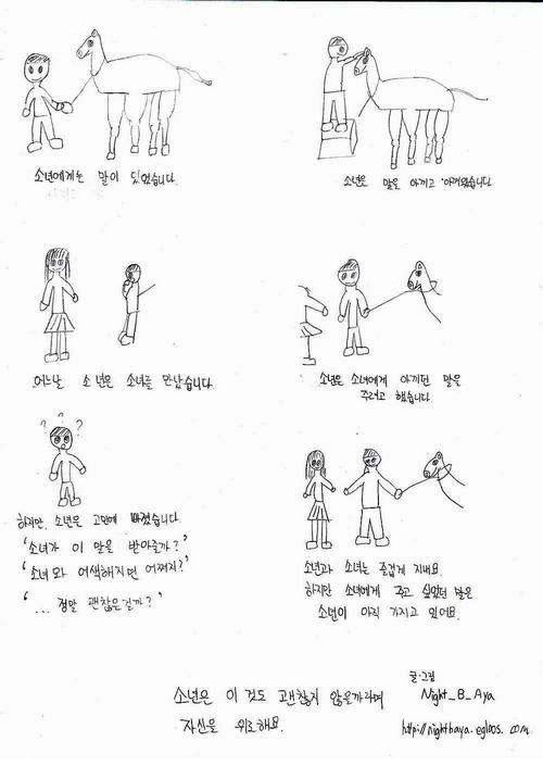 1. 소년에게는 말이 있었어요. 소년에게 그 말은 소년의 유일한 말은 아니었지만 소년에게는 유일한 말이었답니다. 소년은 그 말을 아끼고 또 아꼈어요. 무엇과도 바꿀 수 없을 정도로 소년은 그 말을 소중하게 여겼답니다. 2. 어느날 소년은 소녀를 만났어요. 소년은 소녀에게 많은 것을 해 주고 싶었답니다. 그리고 소년은 자신의 말을 떠올렸어요. 소중하게 아껴온 그 말을 소녀에게 주고 싶다는 생각을 했답니다. 3. 하지만 소년의 머리 속에 한 가지 생각이 떠올랐어요. 자신이 아끼고 아껴왔던 그 말을 소녀가 싫어하면 어떻게 해야 할지 걱정하기 시작했답니다. '소녀가 이 말을 받아 줄까?', '소녀와 어색해지면 어쩌지?', '정말 괜찮을걸까?' 소년에게는 그 말이 소중했지만 소녀도 같은 생각일지 고민에 빠졌어요. 소년의 머리에서 그 걱정은 떠나지 않았답니다. 4. 소년과 소녀는 즐겁게 지내요. 소년은 소녀와 행복한 시간을 보낸답니다. 하지만 소녀에게 주고 싶었던 그 말은 아직 소년이 가지고 있어요. 소년은 이 것도 괜찮지 않을까라며 자신을 위로해요. ====================================================================================== 오래 전 혼자 종이에 끄적거렸던 그림과 글이었는데 문장 몇 개를 더해 올려봅니다. 글 쓰기에 재능이 없는지 글이 길게는 안나오네요. 크크. 별 생각 없이 올렸더니 그림이 너무 컸네요. 크기 줄였습니다. 1