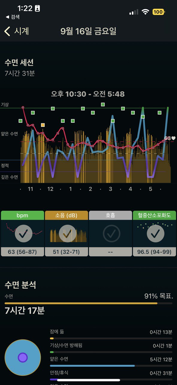 아침에 잠자리 분석을 통해 수면질도 좀 더 관리하게 되었구요.