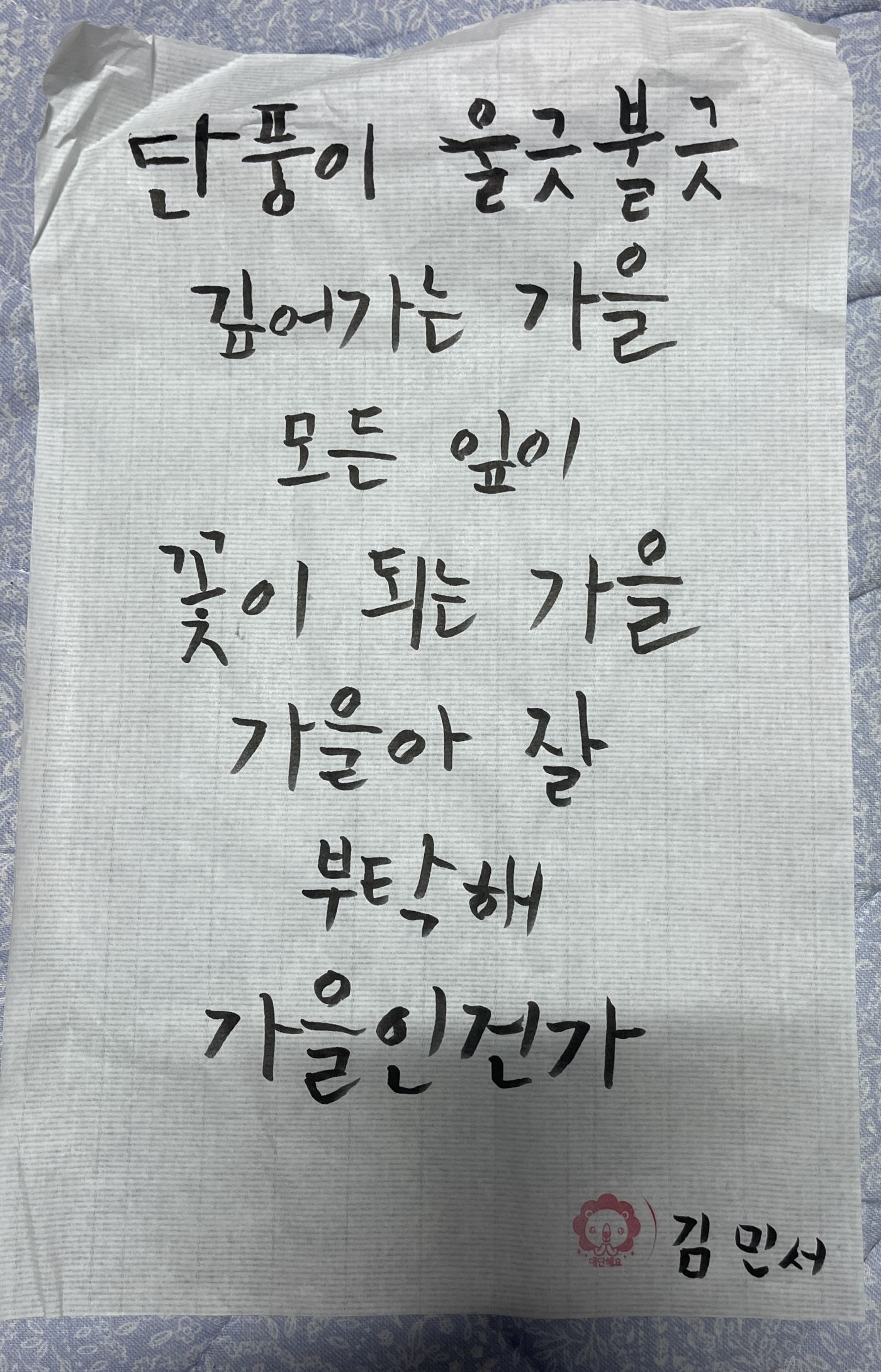 초3 딸내미가 학교에서 붓글씨를 했다고 가지고 온 작품(?)입니다.