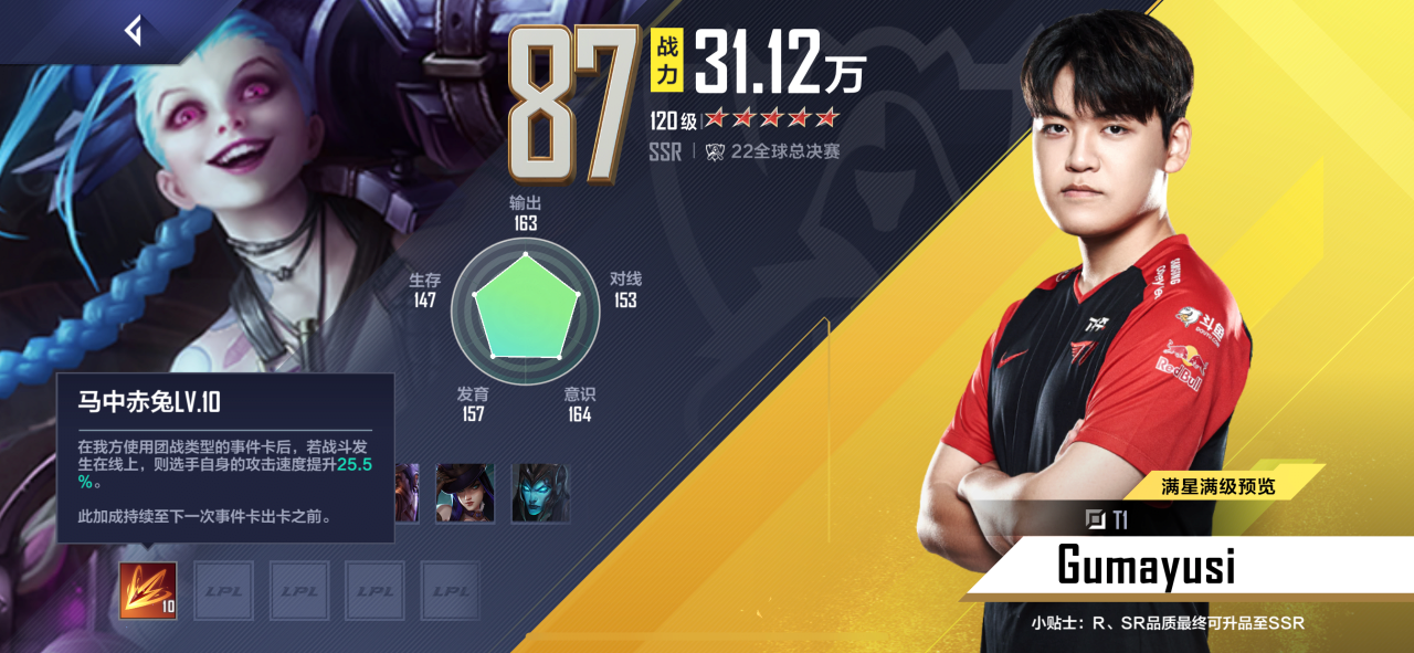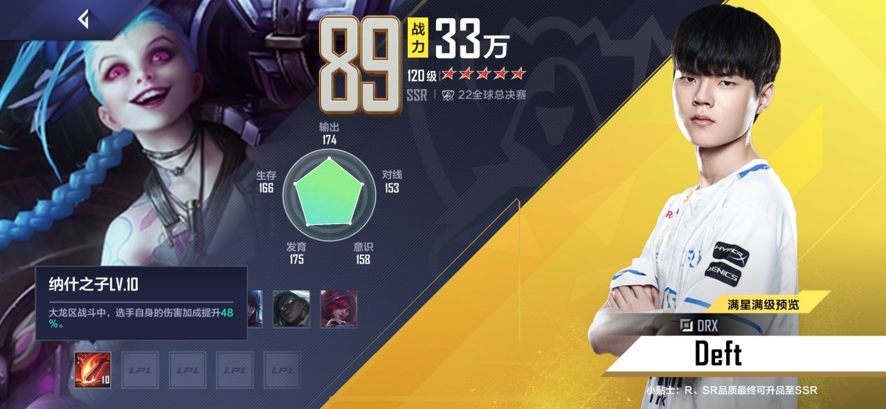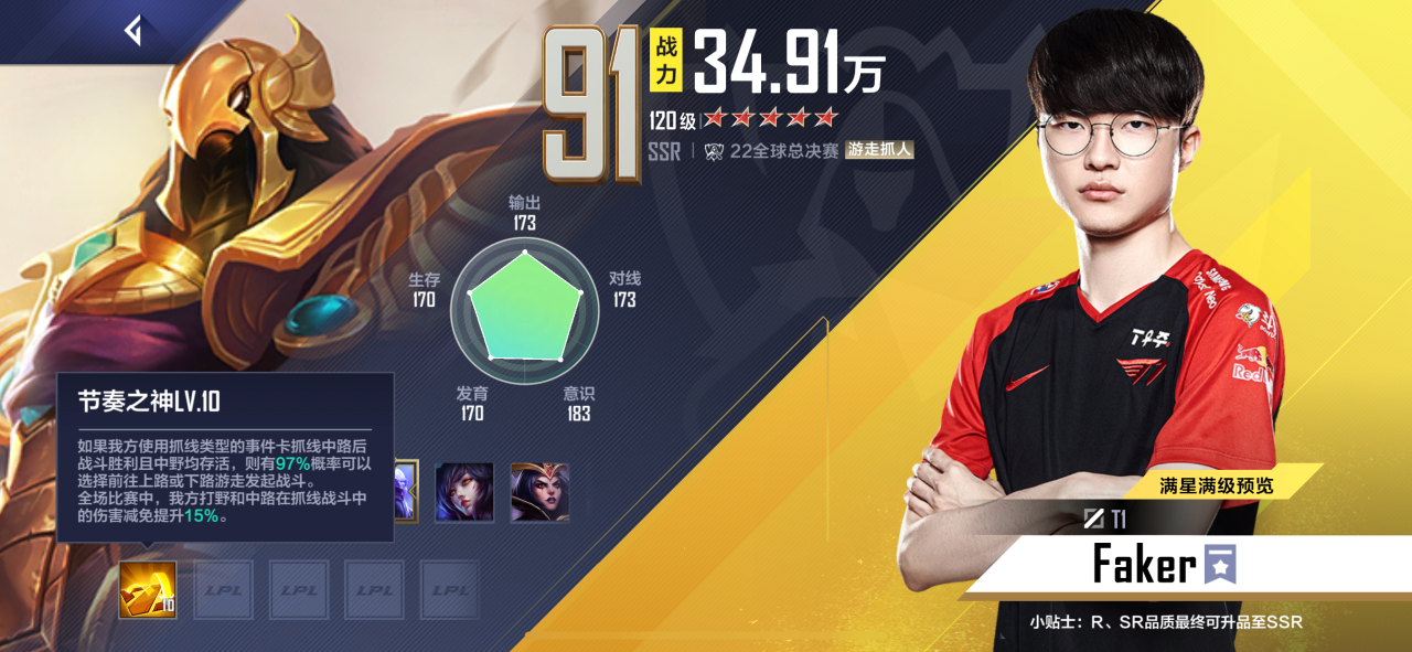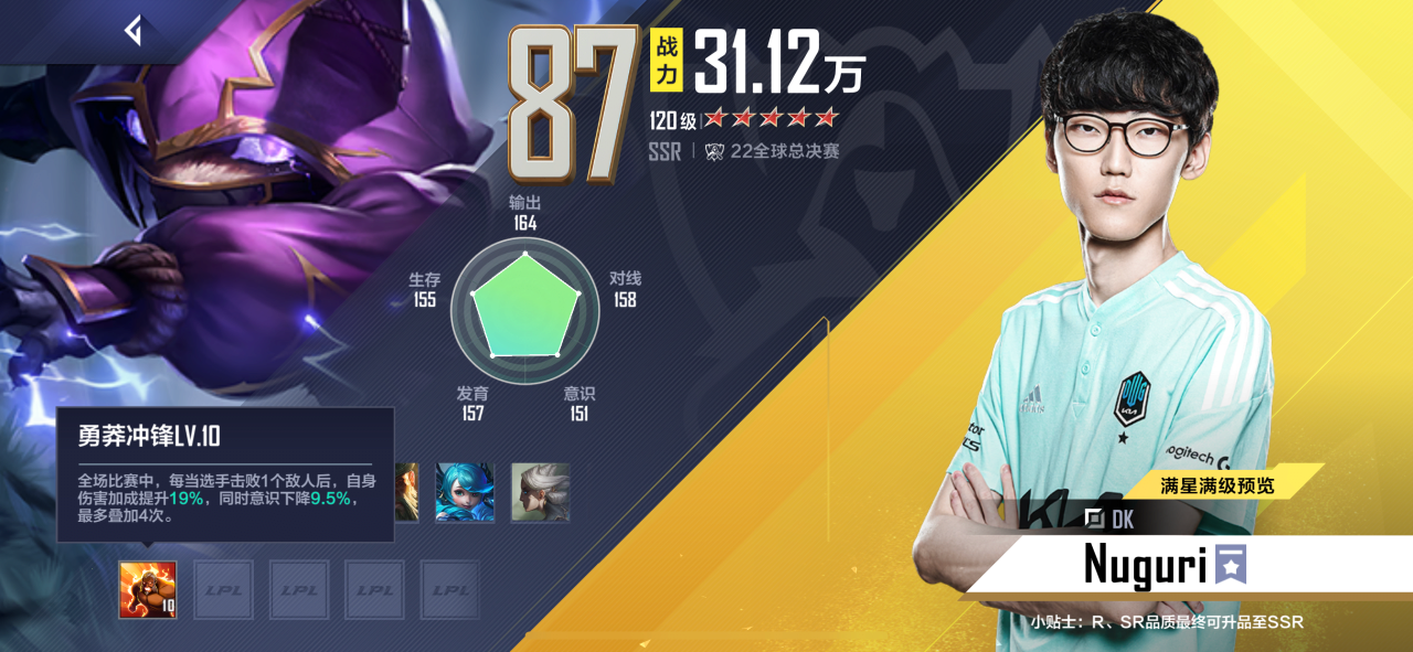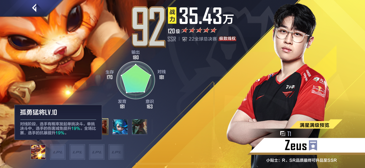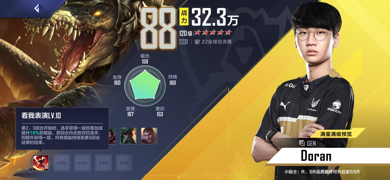 -> 용 교전에서, 체력이 40% 이하로 내려간다면. '최대 체력의 32%' 에 해당하는 보호막 적용 .... 용 교전은 2~4페이즈에 있지만.. 실질적으론 4페이즈만 용 교전이 제대로 있는데 4페이즈 용 교전은 '영혼 주는 거 아니면' 회피해도 별 리스크가 없어서.. 기본적으로 구대기 1호... 인데 원딜이 딜이 아니라 보호막 32%를 받아서 더 애매함 - - 아마도 향로메타에서 우승한거에 대한 고증을 하다보니 이렇게 된듯? -> 바론 교전에서 데미지 48% 증가 심플하게 좋음.. 이스포츠매니저에서 바론 교전은 5~6페이즈에 있음. 데프트가 바론 교전에서 명장면을 꽤 많이 만들었기 때문에 (15 스프링 결승 펜타킬, 18 서머 결승 2세트 카이사 무빙을 비롯해서, 21 선발전 바론 둥지 뚜벅뚜벅 1:4 아펠리오스 등..) 해당 부분을 구현한듯 -> 이벤트 카드 사용 후 '자동으로 진행되는 전투' 라면 공속이 25.5% 증가 사실상 방치형 원딜... 인데.. 이게 원딜이 가질 특성으로는 그냥그냥.. 단지 바텀 2명이 킬도 못따고 죽는.. 스노우볼 역으로 구르는거 방어에는 괜찮음.. 구마유시가 케리아가 혼자 로밍가서 유기된 상황에서도 잘 방어했던 부분을 고증한걸로 보임. -> 1킬 획득 시 마다 데미지 19% 증가, 의식 9.5% 감소 (최대 4중첩 - 데미지 76% 증가, 의식 38% 감소) 앞만보고 달리는 '초 파이어볼형 너구리 재현' (의식 감소하면 갱을 더 잘당하게 됨..) 너구리의 강력한 공격력과, 취약한 방어력을 완벽하게 재현함.. 게임 내에서 실질 성능은 중첩 쌓고 광역 궁 한번 돌리면 한타 끝. 참고로 감소하는 능력치가 탑 기준으론 그렇게 가치가 높지 않아서.. 걍 사기임 -.-; - 라인전 단계에서 결투 확률 증가 결투 시 피해 감소 19% 증가 게임 내내 저항(맞을 때 스킬 데미지 감소) 19% 증가 ............................................... 항상 안정적으로 게임을 하는 제우스의 안정감 반영 탑으로써 사실상 '걍 혼자 두고 유기하기엔 좋은데.. 캐리 라인으로 키우기엔..' - 2, 3 페이즈 시작 시 데미지 18% 증가 적용 해당 페이즈에서 '승리시' 데미지 18% 중첩 획득 추가 중첩은 5페이즈까지만 유지됨. 상당히 특이한 능력이긴 한데. 아는 분과 번역해본거지만 틀리게 안했다면 노골적인 '스노우볼 굴릴때 좋고, 스노우볼 못굴리면 쓸 일 없는' 특성. 분위기를 타는 도란의 특성을 잘 살려서 만든 것으로 보임 - 스킬데미지 36% 증가 쵸비의 괴물같은 성장을 토대로 한 '강력한 딜링 ' 재현. 심플하지만 솔직히 대놓고 괜찮은 능력. 라이너는 딜 높은게 최고임. - 공격로 단계에서 결투시작시, 데미지 19% 적게받음 게임 내내 방어력 21%증가 '안정적으로 게임하고, 어그로핑퐁을 잘 해내는' 쇼메이커의 특성 구현 능력은 좋은데 이 게임에서 미드는 뎀감보다 뎀증이 훨씬 가치가 높다보니 좀 애매함. - 미드 갱킹에서 정글, 미드가 모두 살아남고 상대 미드를 잡았다면 97%확률로 탑 또는 바텀으로 로밍을감 경기전체에서 정글과 미드의 라인전 데미지 감소 15% 적용 -> 탑/바텀으로 로밍을 가면서 게임을 조율해내는 페이커의 성향을 그대로 재현 조건부인 대신, 조건 만족시 게임내 효과는 확실하게 좋음. ............................................... 이스포츠매니저 현재 시즌 마스터 / 전 시즌 마스터 / 전전시즌 다이아 3.. 찍었으니 얼추 평가는 믿으셔도 됨.. 왜 킹겐 제카 덕담이 없나요..라고 하시면 SR은 어차피 실전에서 안쓰기 때문에 굳이 체크할 필요성도 못느껴서.. 0