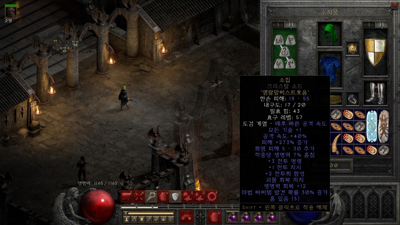 덴오브이블 우선 클리어해주고 진행합니다. 노말과 다른점은 진행 도중 케인 퀘스트를 클리어해주고 워트의 의족을 챙겨줍니다. 이후 타워런은 패스하고 다이렉트로 달려서 안다리엘을 클리어합니다. 액2로 넘어가면 역시 라다먼트는 패스하고 쭉쭉 달립니다. 보통 듀리엘 직전에 30렙이 되는데 30렙이 되면 상점 노가다를 통해 20패캐 붙은 완드와 저항 감소가 충전된 완드를 구매해서 착용합니다. 네크로멘서 전용 스킬 올려주는게 아니라 [레벨 1 저항 감소(67/67)] 이렇게 써있는 완드를 구매하셔야 합니다. 이걸 부무장에 착용하시면 저항 감소 저주를 사용하실 수 있는데 보스전 할 때 써주면 클리어가 한결 빨라집니다. 듀리엘 클리어 할 때 한번 써보시면 성능 확실한 것 확인하실 수 있을겁니다. 이후 액3 진입해서 노말때처럼 쭉 달립니다. 다른점은 여기서는 레벨업 노가다가 필요 없습니다. 모든 퀘를 다 패스하고 그대로 액4, 액5 쭉쭉 달립니다. 액5 도착하면 바바리안 구출퀘 해주고 룬 킵 후 앤야퀘를 깨줍니다. 앤야 지키고있는 애들이 콜드내성인데 얘네들을 유인한 뒤 텔포로 앤야를 클릭해주면 됩니다. 앤야퀘 깨면 높은확률로 20패캐 붙어있는 레어 소서무기를 주는데 이걸로 바꿔껴줍니다. 20패캐 안붙어있으면 그냥 버리고 30렙때 산 20패캐 완드를 껴주시면 됩니다. 이후 바바삼돌이, 바알 다 클리어 한 뒤 라다먼트, 람에센 등 필수퀘들 다 깨줍니다. 그리고 액1로 돌아가서 카우방을 열고 4솟 칼을 먹을때까지 계속 돕니다. 물론 4솟 폴암이 나오면 통찰용으로 킵해둡니다. 4솟 칼을 먹으면 룬워드 영혼을 만들고(룬이 없다면 나이트 카운테스 런을 추가로 해줍니다), 영혼 만든 후에는 찰시 옆에 카우방 포탈을 연 뒤 왔다갔다 하면서 상점노가다를 합니다. 여기서 필요한것은 장갑/신발/벨트인데, 장갑/신발은 단일레지 20이상 붙은것(파이어레지는 랄랄뚜껑을 계속 쓰면 되니 번개레지를 위주로 봅니다. 물론 다른레지도 20이상 붙은게 뜬다면 구매후 킵해둡니다.), 벨트는 17패힛 이상 또는 라이프나 단일레지 많이 붙은거 있으면 삽니다. 헬로 넘어갔을 때 라이트닝/파이어 레지 각각 50정도 확보되어 있으면 훌륭합니다. 또한 나메 클리어때까지 샤에룬과 2솟 방패(아무거나 가능, 정 안나온다면 노말 액2로 돌아가서 파라 노가다를 통해 구매 가능) 먹었다면 룬워드 각운을 만들어서 껴줍니다. 아마 4솟칼보다는 2솟방패와 샤에룬을 더 빨리 먹을겁니다.