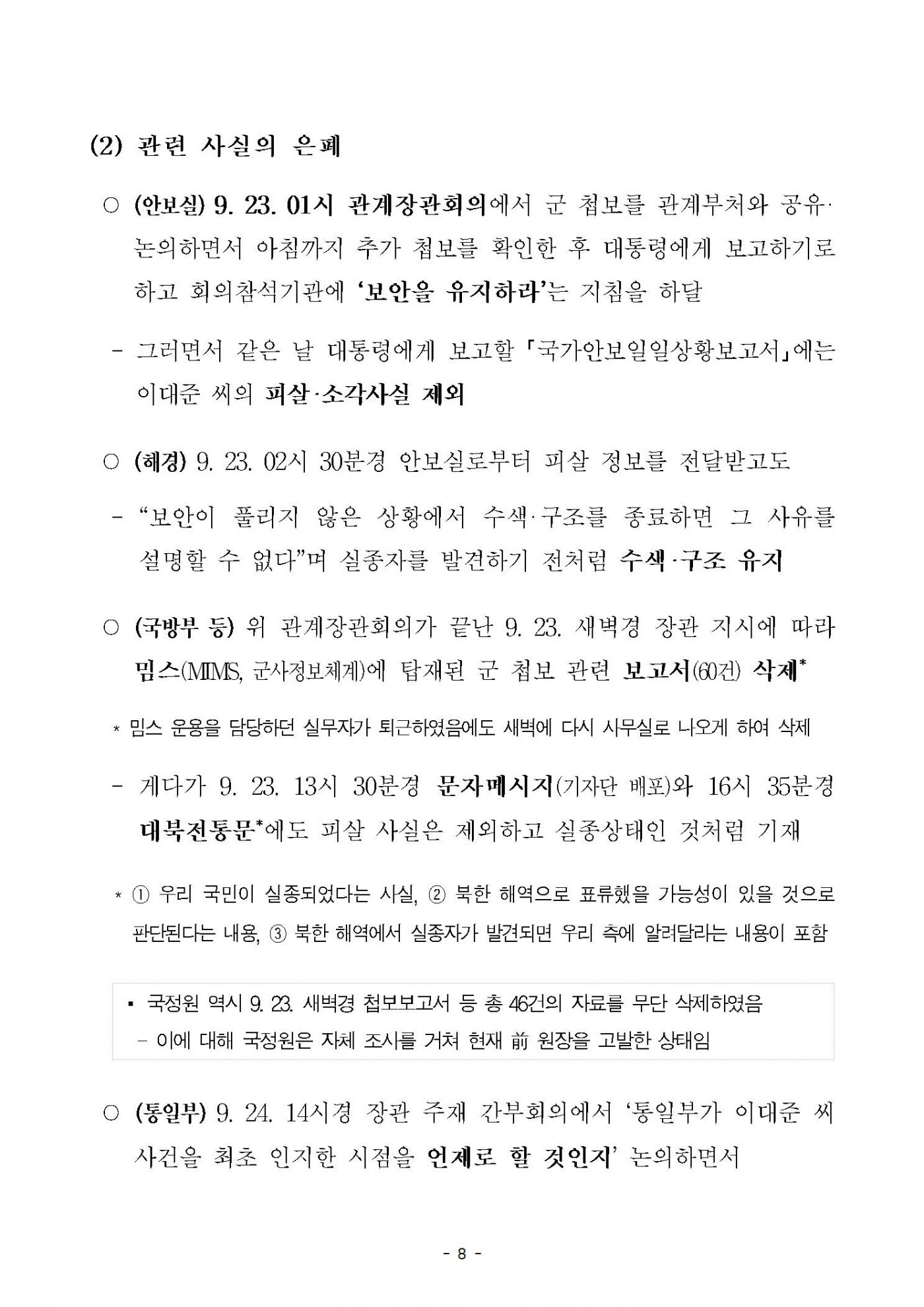 -국방부는 9.23 장관 지시로 군사정보체계에 탑재된 군사첩보보고서 60건의 정보를 삭제.(퇴근한 담장자를 새벽에 불러서 삭제) 기자단 보도자료, 대북전통문에도 피살 내용을 실종으로 바꿔서 전달.