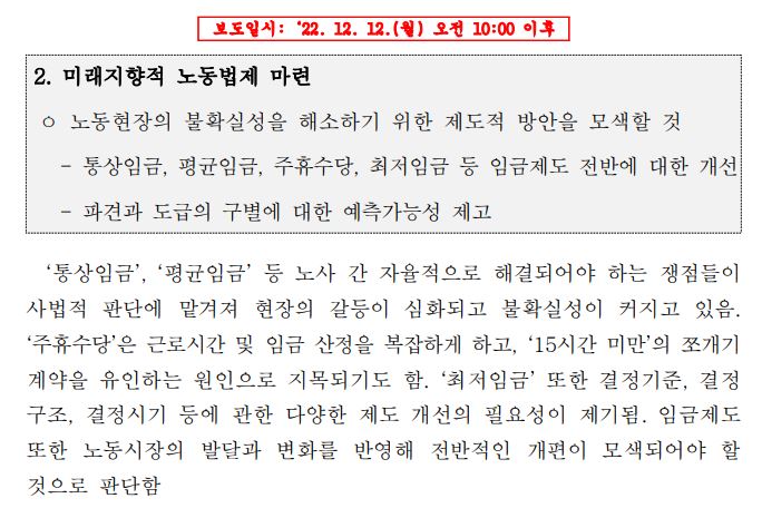 - 통상임금, 평균임금, [주휴수당], 최저임금 등 임금제도 전반에 대한 개선