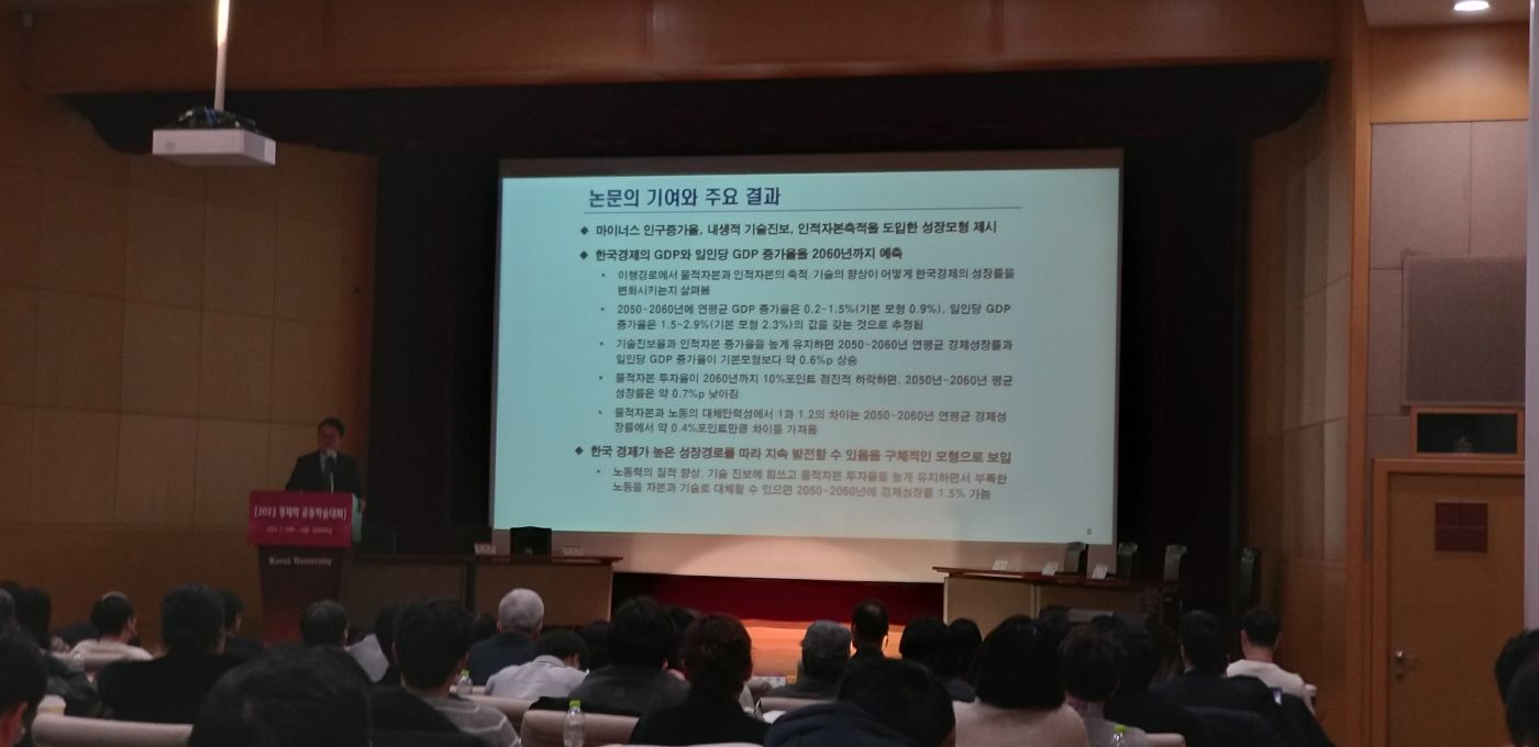 이종화 교수님은 인증사진에서 보다시피 한국에서 극심한 인구감소, 저출산 고령화로 경제성장률이 떨어지는 건 부정하지 않습니다. 다른 게 변하지 않는다는 전제 하에서, 2050-60년대에 한국 경제성장률이 0.9%, 1인당 gdp가 2.3%까지 떨어진다는 게 긍정적인 예측이라 보기는 힘들죠.