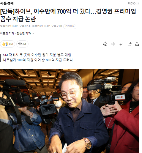 하이브가 이수만 전 총괄프로듀서의 SM엔터테인먼트 지분을 사들이면서 이 전 총괄이 보유한 SM엔터 자회사 지분을 총 700억 원에 매입해준 것으로 드러났다. 하이브는 이 전 총괄이 주도하는 ‘나무 심기’에도 향후 10년간 총 100억 원을 지원하기로 계약한 사실이 최근 알려진 바 있다. 하이브가 이 전 총괄에게 꼼수로 경영권 프리미엄을 인정해주며 소액주주들에게 피해를 입혔다는 논란이 거세질 것으로 전망된다. 700억이나 꼼수로 더 챙긴거 실화...? 이수만한테 sm 직원들과 주주들보다 몇배나 더 많은 돈이 빨려들어간건지.... 노답 0