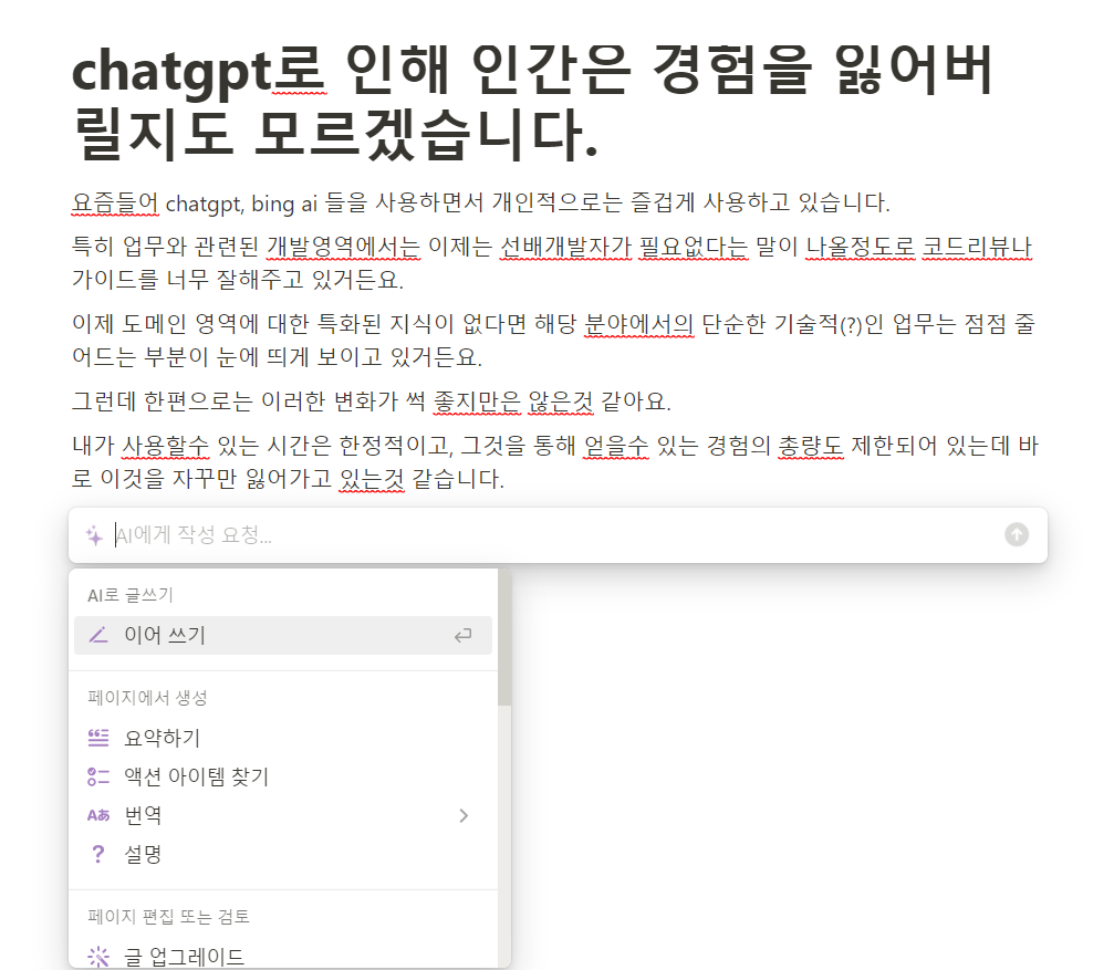 심지어 이글을 노션을 통해 쓰고 있었는데, 스페이스바만 누르면 AI가 예쁘게 대기하고 있습니다.