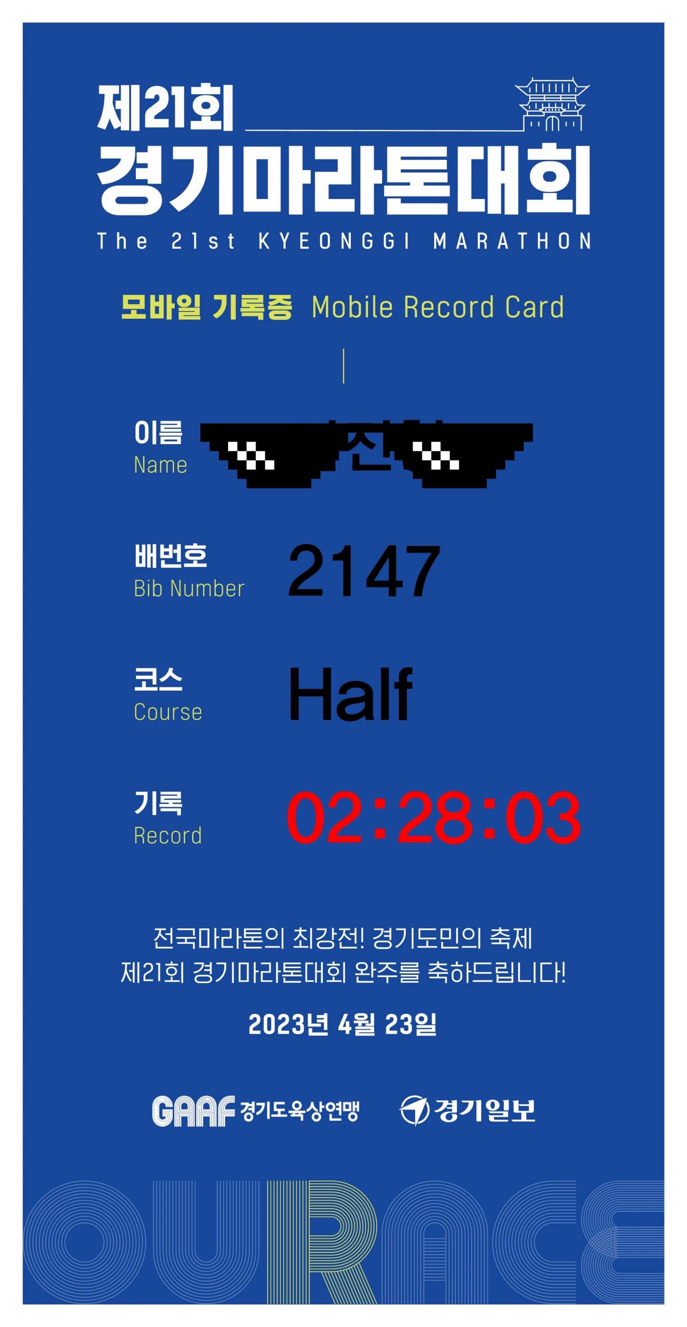 함께 달려준 와이프에게 고마움을 느끼고 완주한 저에게 뿌듯함을 느끼고 있습니다.