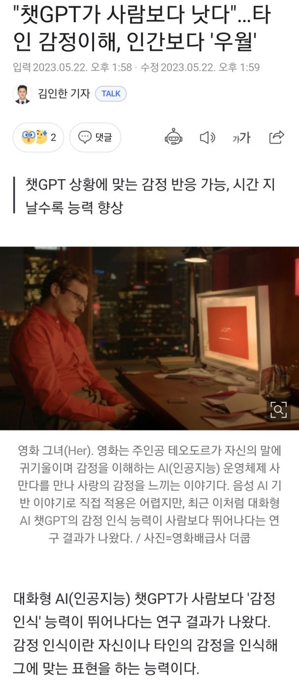 연구팀은 "이번 연구는 챗GPT가 상황에 맞는 감정적 반응을 만들 수 있을 뿐만 아니라 시간이 지남에 따라 감정 인식 성능이 크게 향상된다는 사실을 보여준다"고 밝혔다.