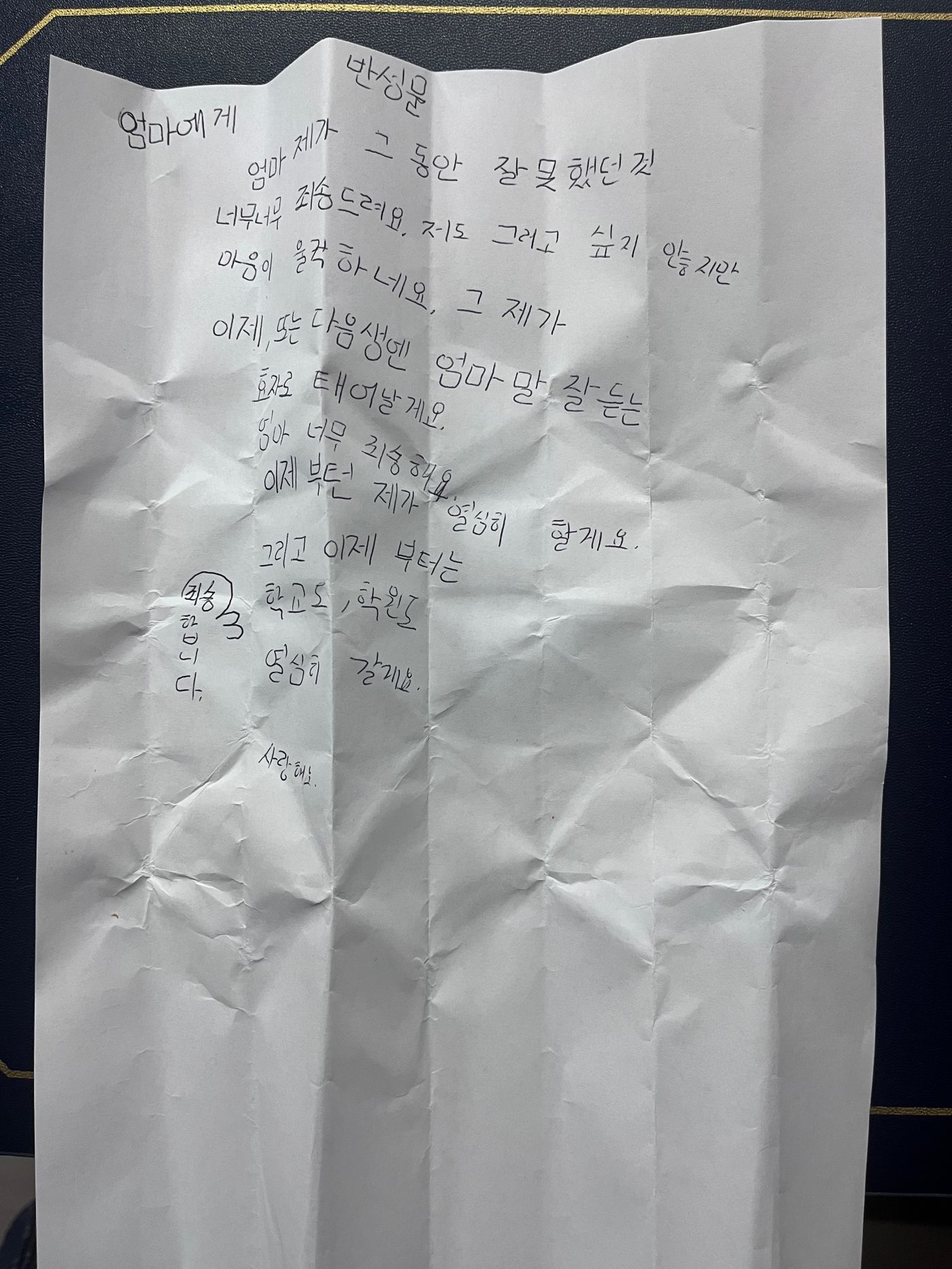 그리고 그 다음날 아침이 되니 시키지도 않았는데 저런 반성문을 작성했더라구요.