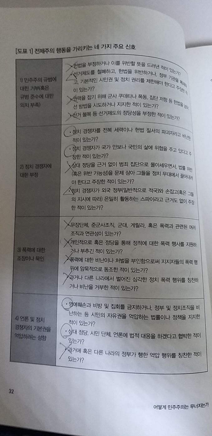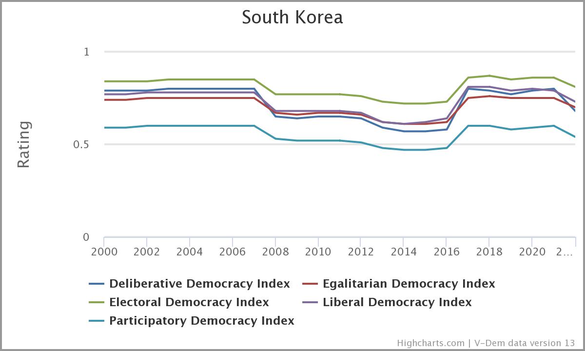 근래 윤석열의 극성스러운 언행 보고 생각나서, 민주주의의 권위주의로의 후퇴를 연구한 학자들이 만든 지도자의 전체주의성 진단테스트를 돌려 봤습니다. 출처는 스티븐 레비츠키와 대니얼 지블랫, 어떻게 민주주의는 무너지는가, 박세연 역, 어크로스, 2018, 32p 다행이 트럼프처럼 네 항목 모두에 문제가 발견된(책 참조) 수준은 아니고, 윤석열이 헌정을 부정하고 정치 폭력을 조장/정당화하는 등 민주주의의 기본 원칙까지 훼손하는 수준은 아니지만 윤석열은 2) 정치 경쟁자에 대한 부정과 4)언론 및 정치 경쟁자의 기본권을 침해하려는 성향에서 적신호가 관찰됐습니다. 야권과 언론을 거친 언행과 검찰권력으로 압제하려던 모습이 지표로 나타난 것 같습니다. 재작년 제가 문재인-이재명을 진단해본 결과를 가져와 비교하자면 ![]() 전반적으로 윤석열은 문재인/이재명보다 전제주의 성향이 다소 높게 나타납니다. 1)과 4)는 윤석열이 문재인/이재명보다 다소 높았고, 특히 2) 정치 경쟁자에 대한 부정 항목에서 유독 높은 점수를 보였습니다. 윤석열이 양념 드립을 친다던가 손가락혁명군 육성한다던가 그랬던 없어서 3) 항목은 문재인-이재명보다 나은데, 이건 온라인 폭력이라 '물리적인' 폭력행위와 등치시키기 애매한 부분이 있어서... ![]() 실제로 학계에서 제일 많이 쓰이는 V-Dem 지표를 가져와 보자면 이명박-박근혜때 후퇴했던 민주주의 지표는 박근혜 탄핵 + 문재인 정부 취임으로 개선되었다가 윤석열 정부 들어서 악화되었습니다. 문재인, 이재명이 수직적인 포퓰리스트라면 (https://www.redtea.kr/free/12185 참고) 윤석열은 우파 권위주의 포퓰리스트인데, 문재인-이재명은 포퓰리스트성이 약했거나 있더라도 수직적인 양상이기에 민주주의 후퇴까진 아니었지만 윤석열은 상대적으로 포퓰리스트성이 강하고 우파 권위주의 양상이었기에 민주주의 후퇴를 진단한 게 아닌가 싶습니다. 윤석열이 퇴임할 무렵, 혹은 진보정권으로 정권교체될 무렵의 한국 민주주의 지표는 어느 수준일지 궁금합니다. 박근혜 말기보다 높은 수준일지, 비슷한 수준일지, 아니면 그때보다도 낮은 수준일지. 10