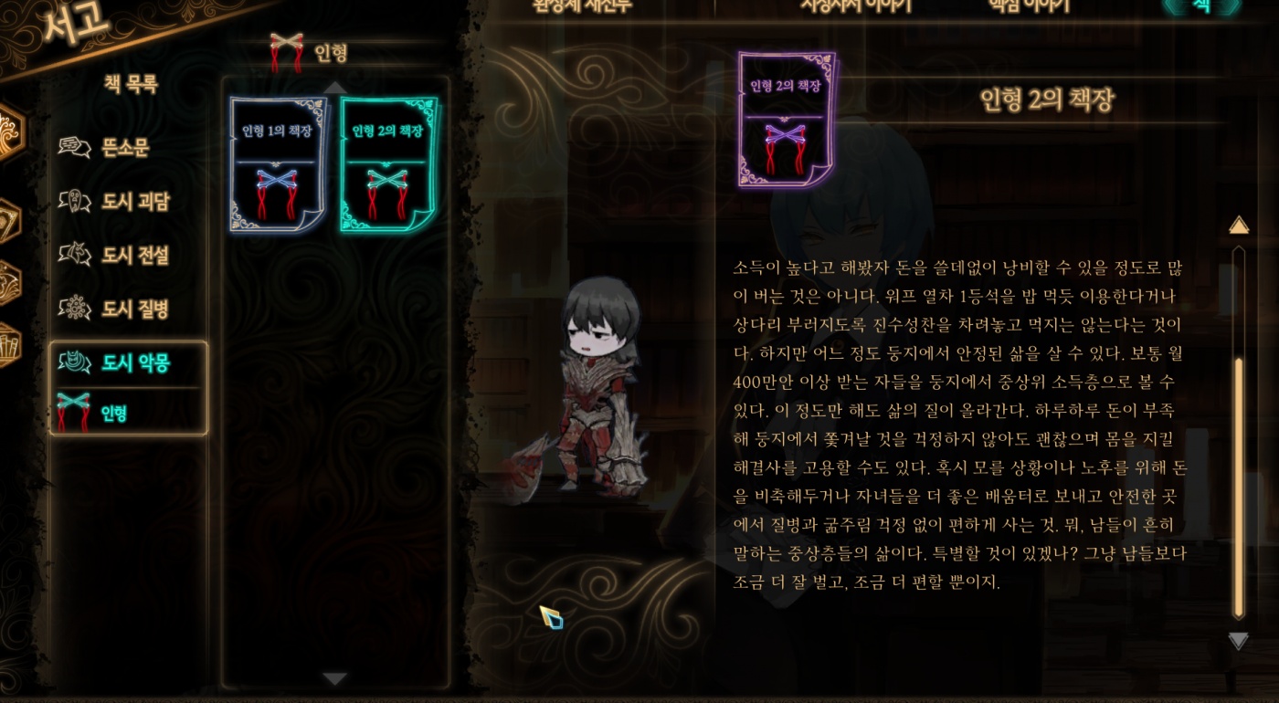 다만 이 게임의 문제점은 모든 인물 하나하나 긴 장문의 책을 써놨을 정도로 세계관이 탄탄하고 할말이 많은 게임이면서, 동시에 그를 게임성으로도 구현하려 했기 때문에, 게임 UI가 좋지 못하고 게임성도 심플하지가 않습니다.