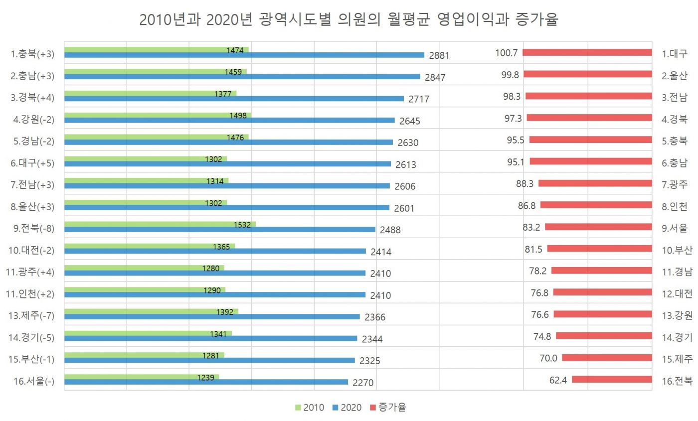 의원, 치과의원, 한의원의 2010,2020 영업이익 비교.