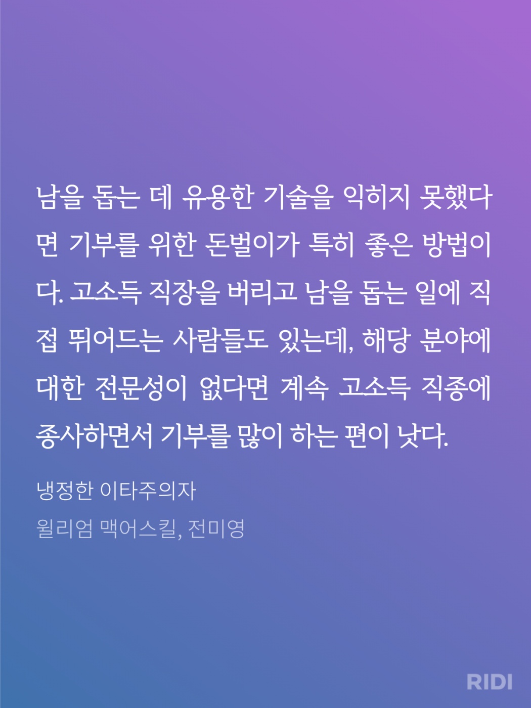 이 책은 저자가 기부, 나아가 인류에 공헌하는 가장 효율적인 방법을 찾아가는 여정을 그리고 있다. 그리고 이 책을 읽기를 기대하는 독자를 이미 기부를 하고 있는 사람이거나 기부를 할 생각으로 가득찬 사람으로 한정하고, 그 사람들만이 이 책을 읽기를 기대하고 있다.