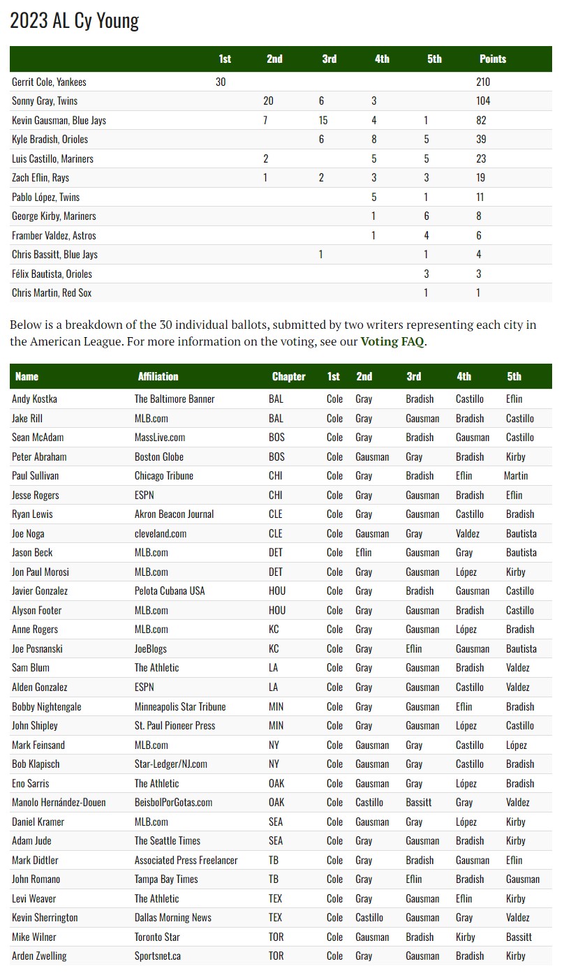 게릿 콜은 첫 사이영을 만장일치로 수상했네요