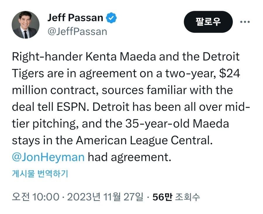 마에다 켄타가 디트로이트와 2년 24M 계약을 했네요