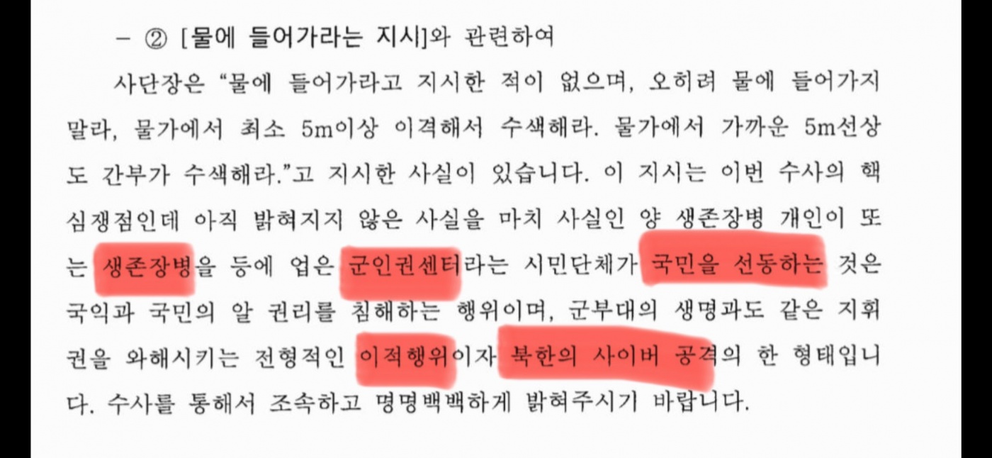 평가절하하고, 수근이의 고귀한 희생을 폄훼하는 명예훼손을 했다고 써놨습니다. 저도 그 작전에 투입되었던 사람입니다. 수해를 겪은 주민들을 위해 했던 고생과 보람을 스스로 깎아내릴 이유가 없습니다. 다만 우리의 피땀을 왜 사단장의 명예를 드높이기 위해 엉뚱한 방법으로 동원하다가 소중한