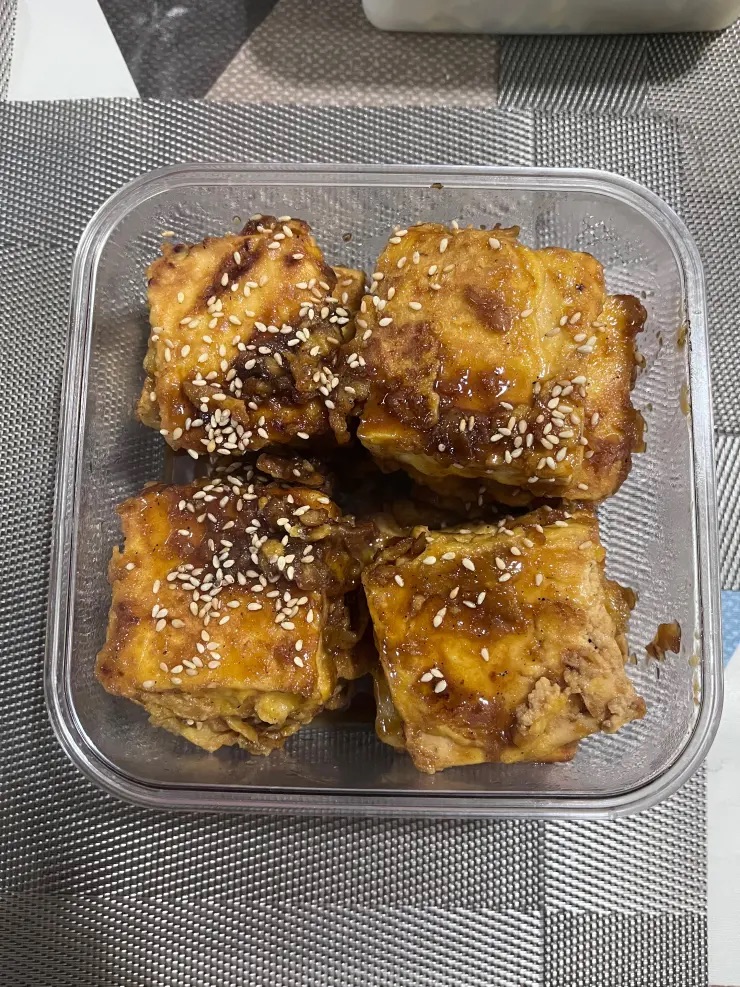 두부를 잘라서 부침가루와 계란으로 굽고 와이프가 준 양념장에 졸였어요.