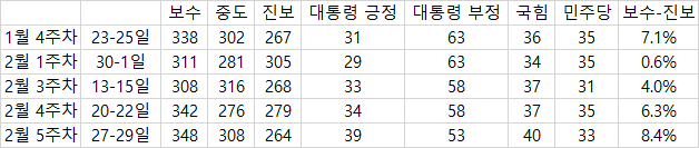 그리고 2월1주차에는 오히려 진보와 보수 응답자가 거의 같은 숫자로 표집되면서